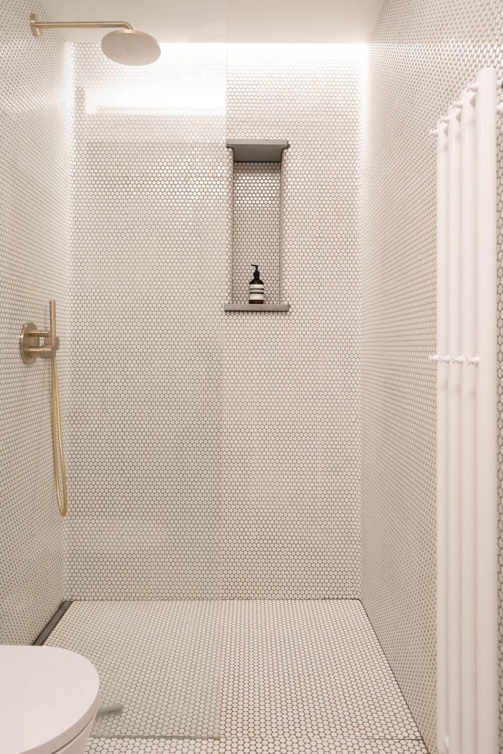 Last (but definitely not least), the bathroom. This features a penny-style pattern, which singel-handedly adds visual interest. The vanity features a vessel sink paired with minimal gold hardware and wooden cabinetry. Simultaneously, the bathtub gives residents a chance for a good soak, while the shower cubicle—with its recessed shelving—makes sure the space is as functional as it is stylish.