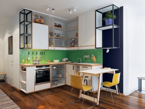 Having the kitchen and living room undivided is one this, but this home takes it a bit further, using glass doors to separate the public area from the private bedroom. Pretty bold, but very stylish.