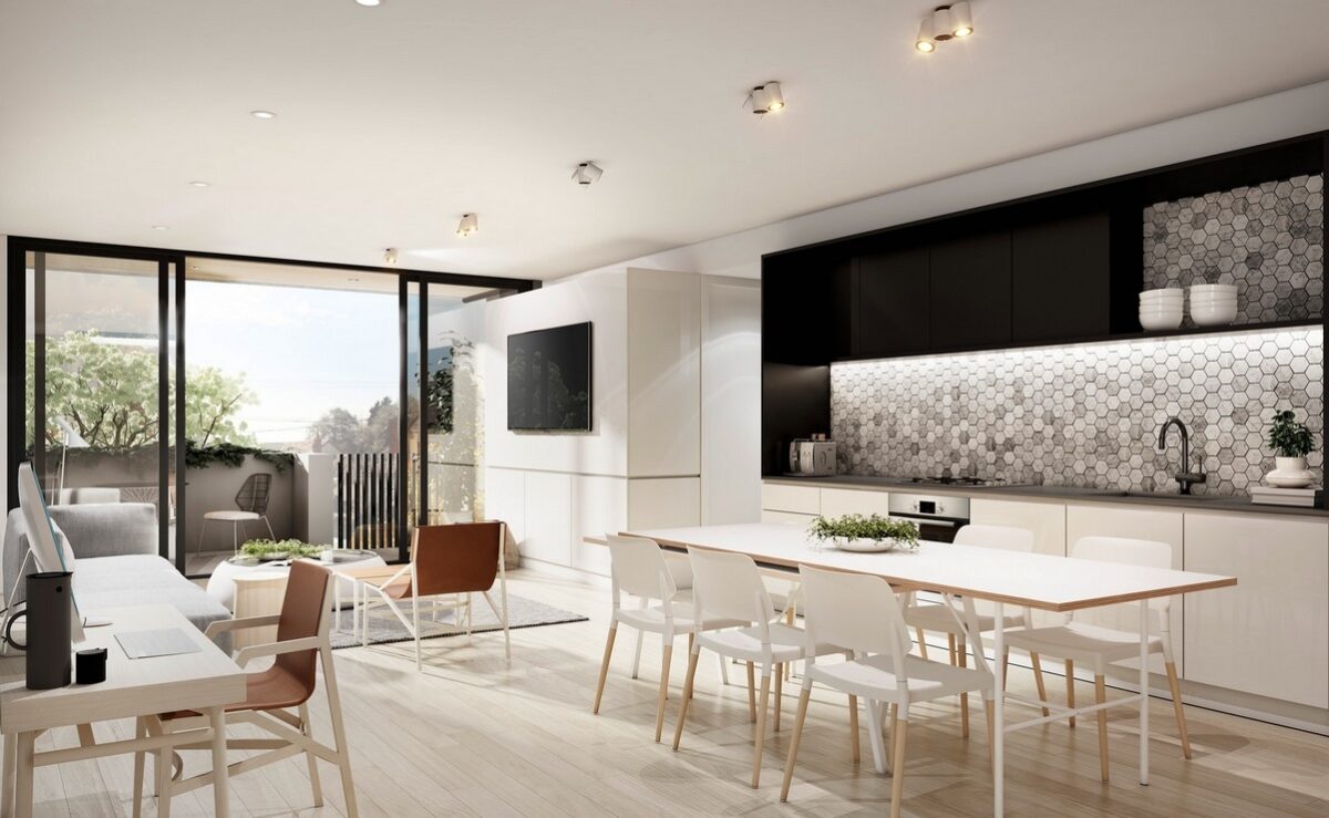 Finally, this beautiful modern apartment has accordion glass doors that make the open floor plan feel like it includes the whole world.