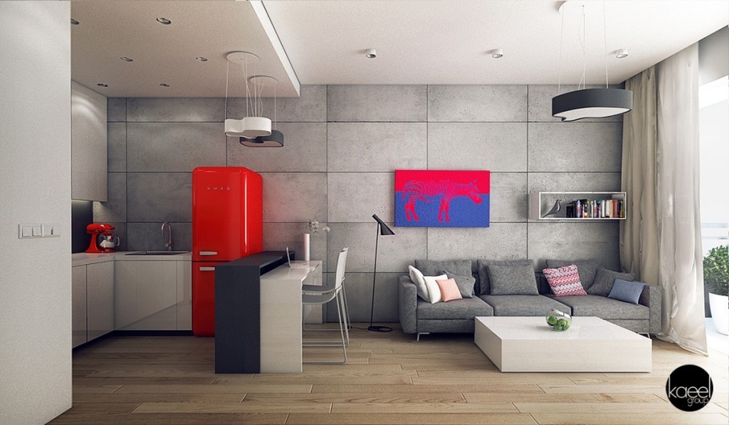 The open design here allows the color scheme from the kitchen - grey concrete with pops of red - to spill over into the living room, making the whole space feel unified. The large modern coffee table is a nice touch.