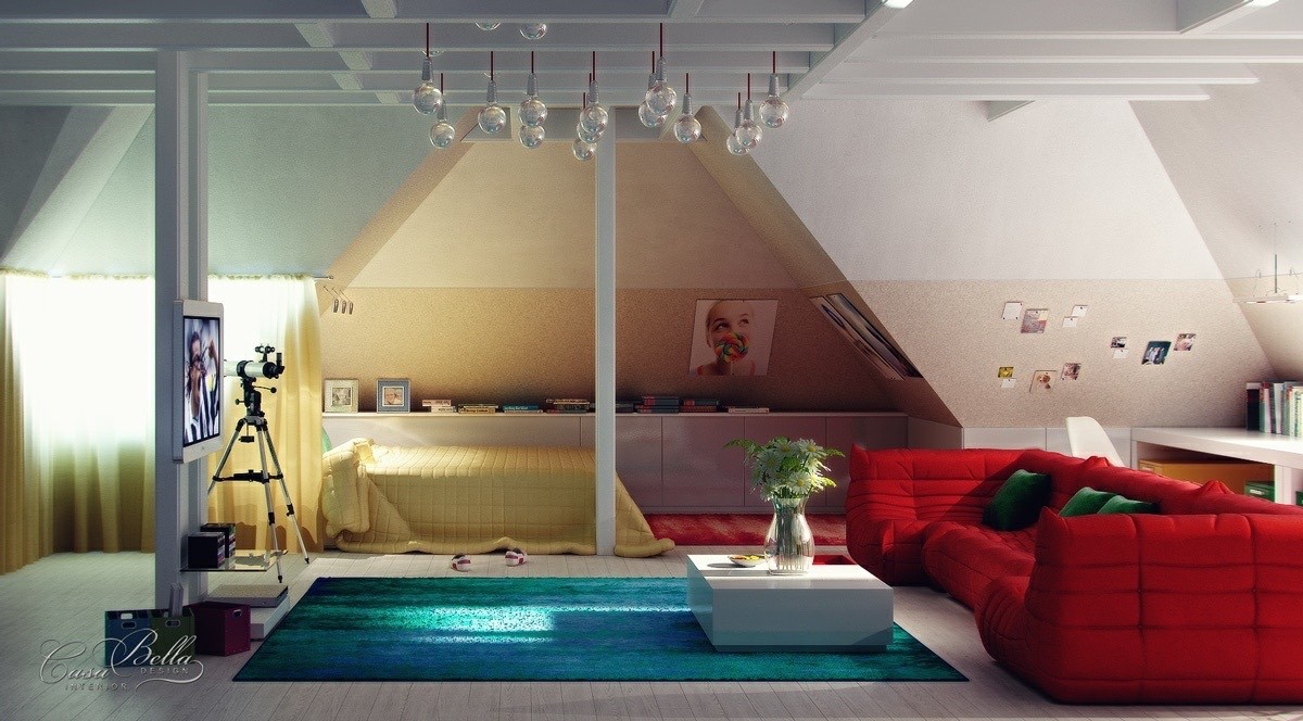 This room is much more than just a place to sleep. As you can see, there is a space to work and a couch for entertaining. Although this room is perfect for a teen to escape to, the design is sophisticated enough for an adult. Beams cross through the space and the exposed brick make it full of character. Lighting above the window on the bookshelf adds a modern twist. Another cool aspect is the mural painted near the bed.