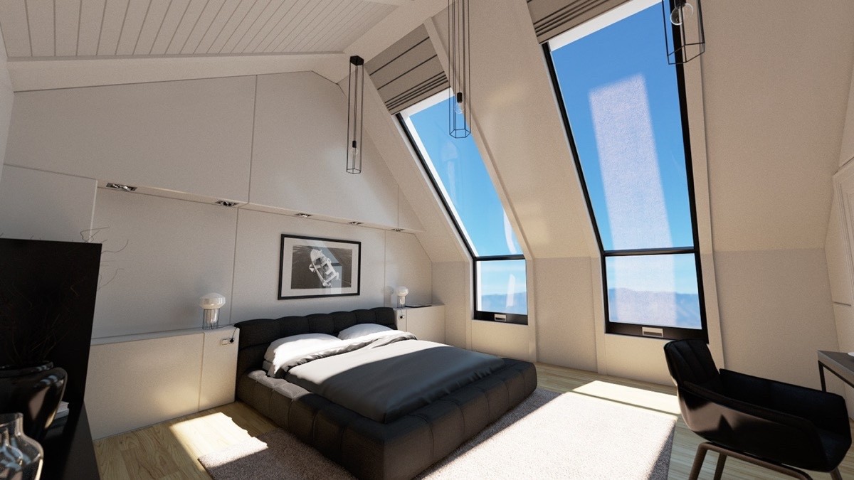 Wood walls don't make this bedroom look dark because they are lit up by the large angular window. The white platform bed contrasts well with the wooden accents and matches the modern floor rug. A quaint desk is tucked away in the corner, which makes this attic feel feminine and delicate. The bedroom chandelier adds to the charm.
