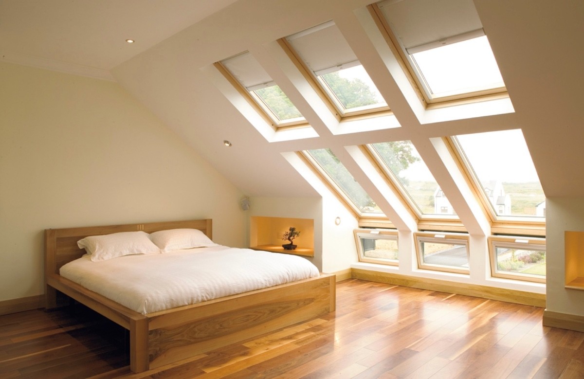 Look closely at the left of the windows and you'll see a built-in that lights up a small bonsai tree. This accent clearly suggests to the viewer that this room is dedicated to being a zen space. The bed is made of the same wood as the floors and the inside of the windows. With bare colors and even less accents this attic bedroom is a place to think and meditate.