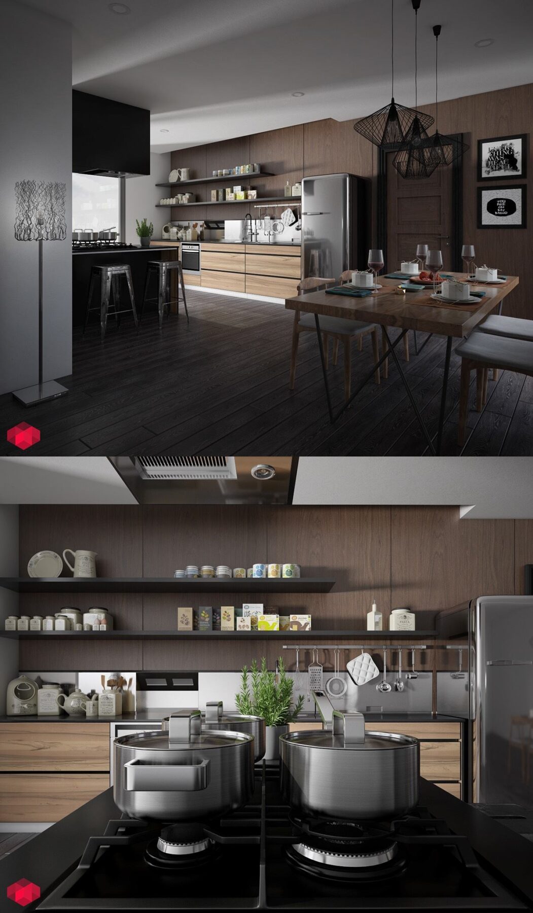 Industrial and classical elements come together to create a sophisticated space in this open kitchen. The walls are clad with dark wood, with lighter tones used on the cabinet faces. Stainless steel elements add bright highlights. Keep in mind that having an open shelving approach like this means that every one of your accessories on display - including knives, wine glasses, mugs, cutting boards, teapots, cookie jars, etc. - need to be on point.