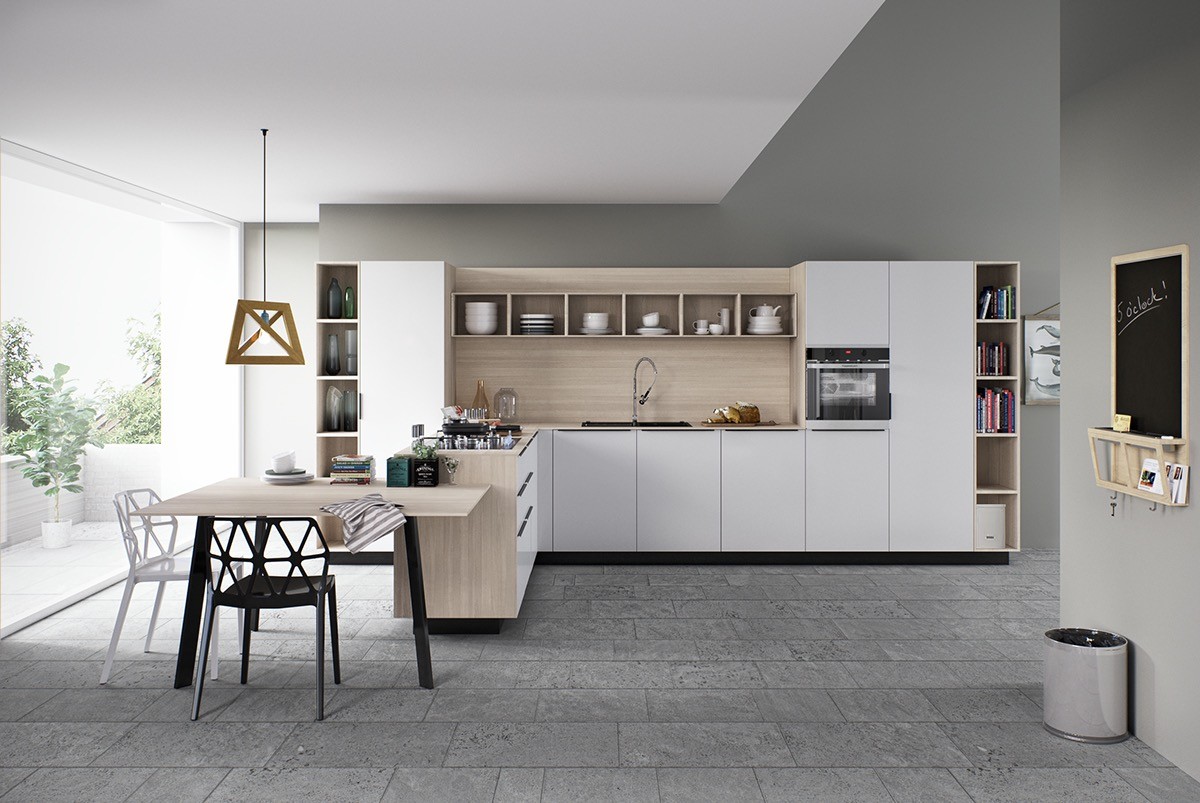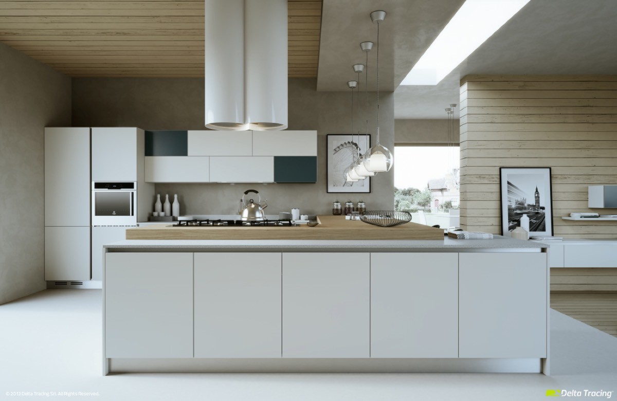 Stone floor slabs are the perfect neutral canvas for this white and wood kitchen, echoing the metallic material of the suspended range hood above.