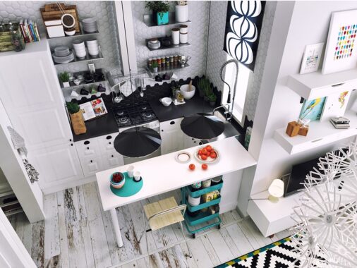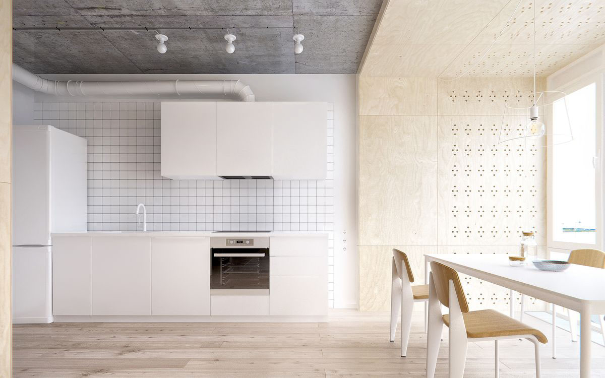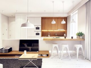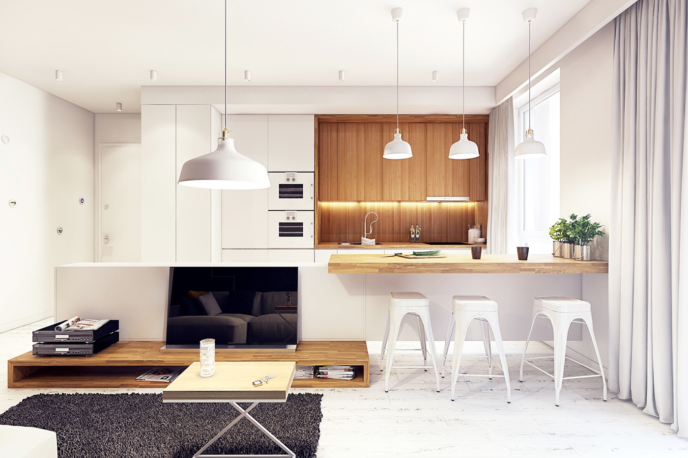 Wood elements are balanced well to lend a sense of visual weight and depth to the otherwise small apartment. The recessed kitchen counter is especially neat and cozy-looking, outfitted with vertical wood grain from top to bottom.