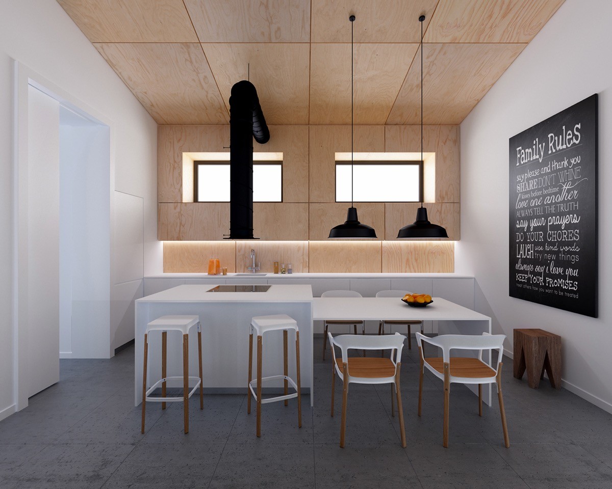 This kitchen employs wood elements very selectively. The two monolithic units to the left are especially interesting – aligned with small interior walls to separate the kitchen from the living room without impeding the natural light sources, connected by one horizontal piece of wood for visual interest.