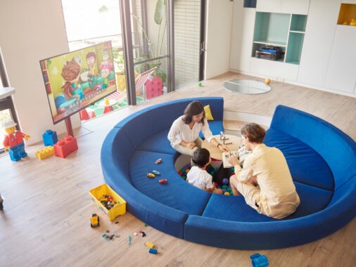 It would be hard to go wrong with such a nice view through expansive corner windows like those. Uncomplicated decor preserves the emphasis on the garden outside, and a nice blue rug enhances the connection with the sky.