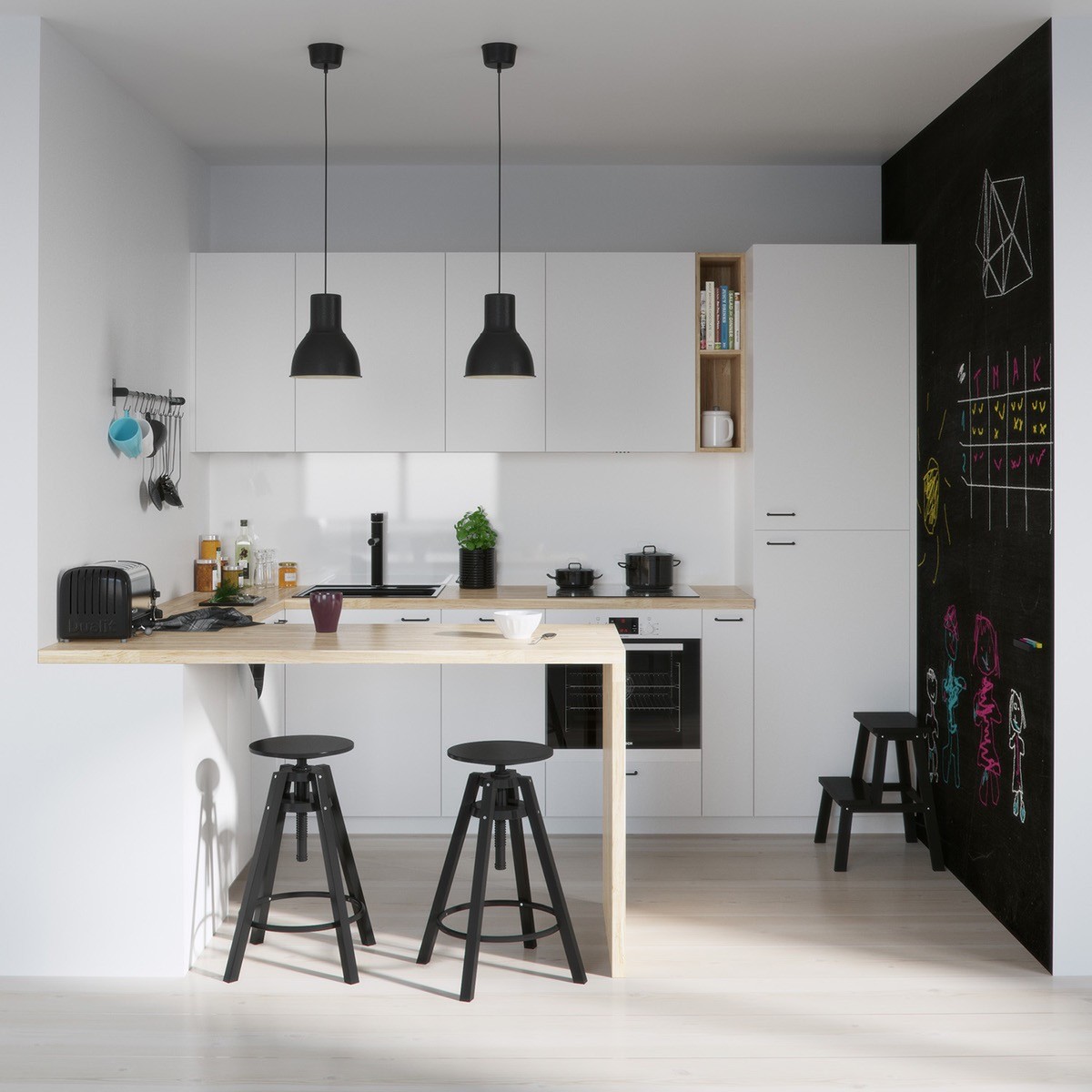 Fresh and creative. This kitchen contrasts dark and light materials for a powerful visual effect, echoed in the stylish dip-painted kitchen bar stools and powerful geometric artwork. The black and white print on the wall is the work of the hugely popular Jenny Liz Rome.