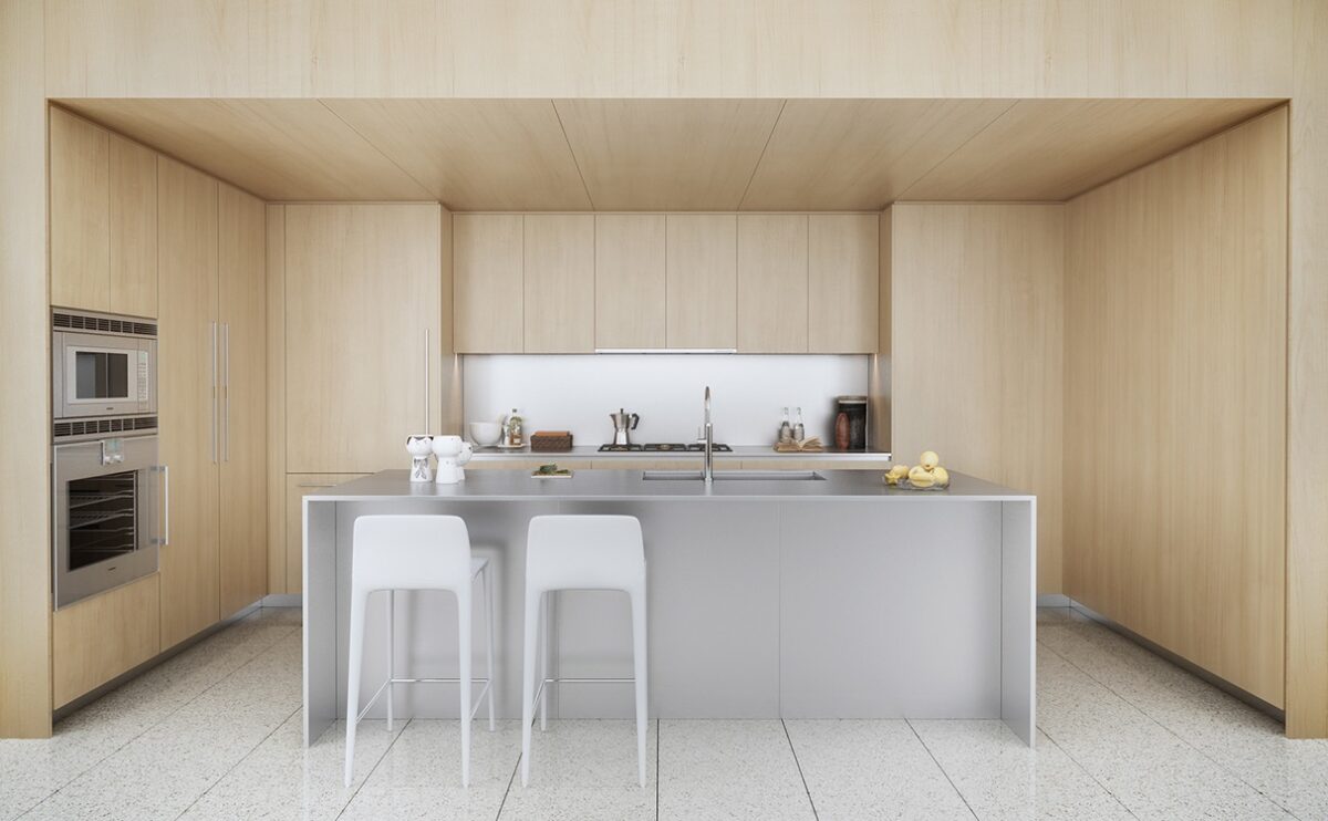 A sleek wood shell wraps cuts a low profile around white cabinetry, standing out from the monochromatic color themes in the background.