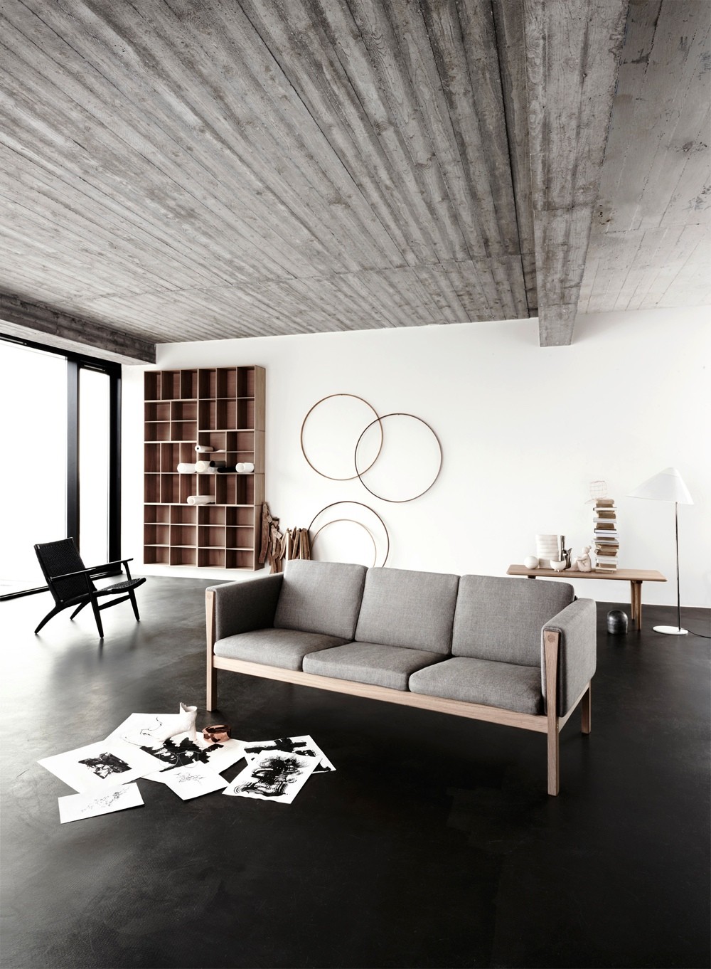 Sliding doors and lots of windows provide much needed light in a basement living space. The white walls and furniture also contribute to the brightness of the room.
