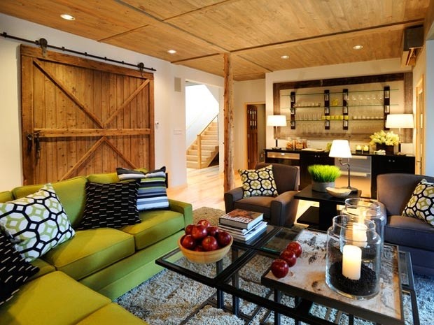 Fresh cilantro and inky black make an impact against rustic wood elements in this attractive basement living space remodel.