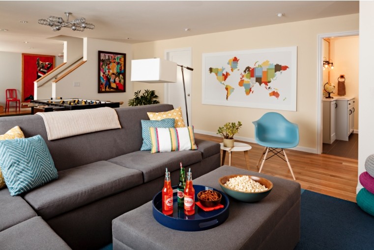 Vibrant pops of color bring this basement living space to life.