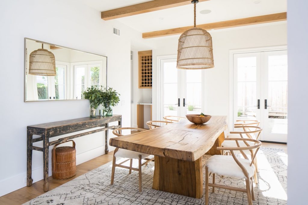 Sitting beneath another rattan shade (though this one being of a smaller scale), a chunky wooden dining table looks the part with a beautiful live edge.