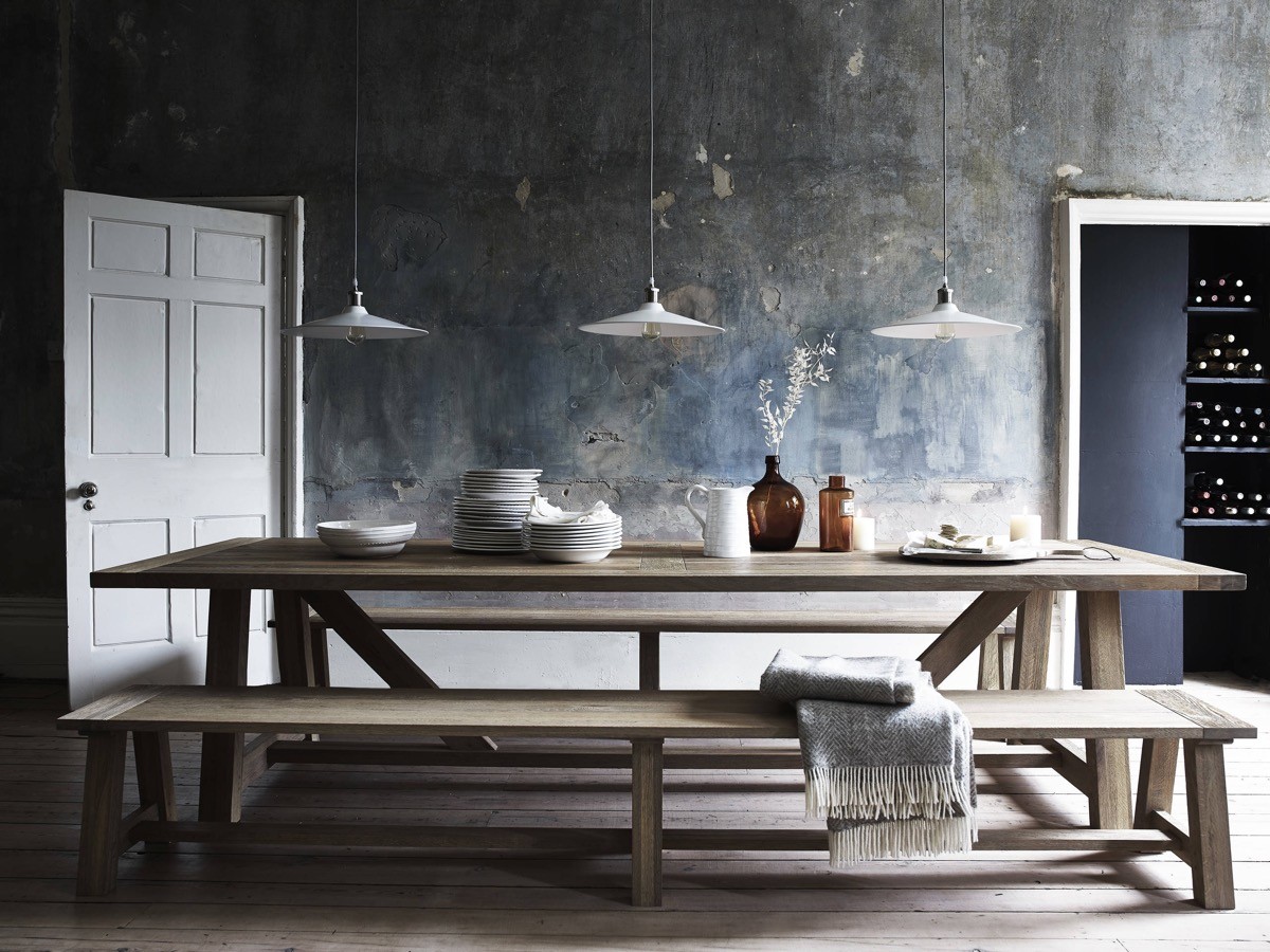 Rustic decor can have a wonderful warmth about it, making it the perfect decor style to bestow upon a dining room, all set for feeding the family or entertaining guests. Although, rustic style can also be injected with many different influences, such as industrial chic, tribal, geometric, modern or traditional. With so many directions to go in it can be difficult to know which one is right for you and your home. So to help we have put together an extensive selection of rustic dining room decor schemes that include a multitude of rustic dining tables, accent dining chairs and wooden benches, oversized dining pendant lights, and rustic wall decor.