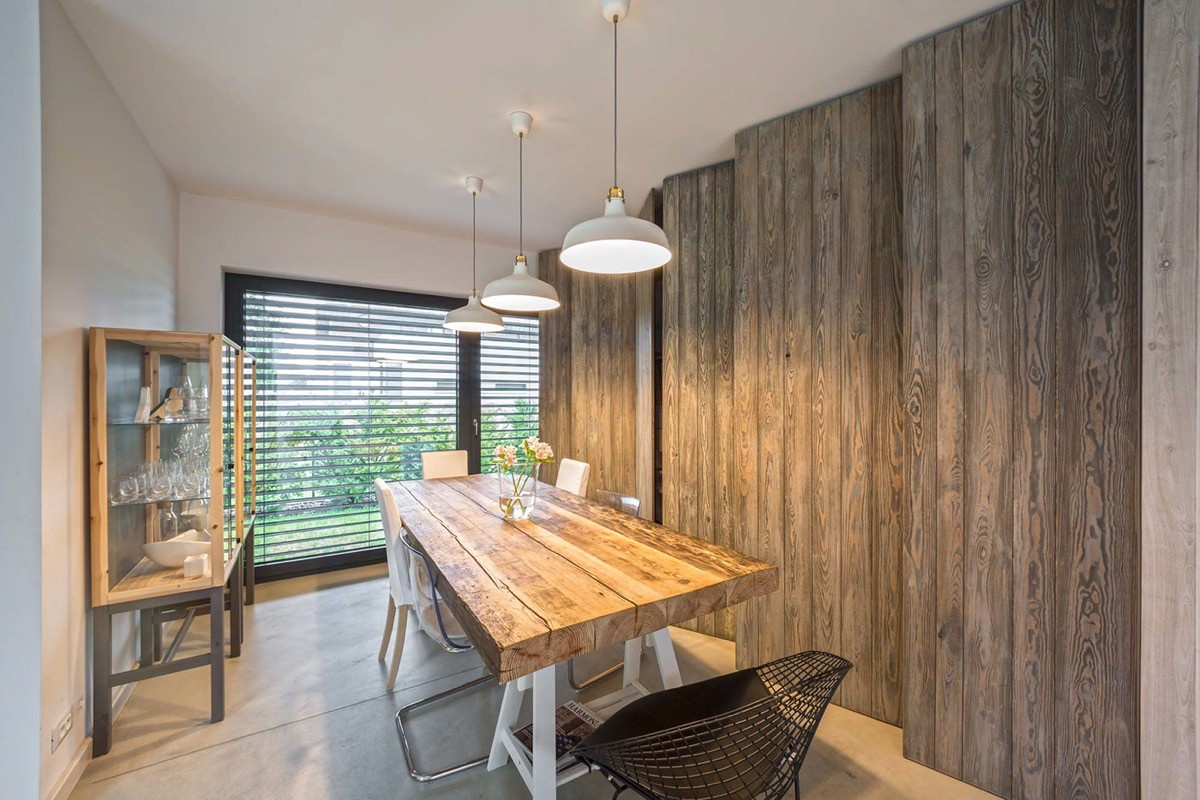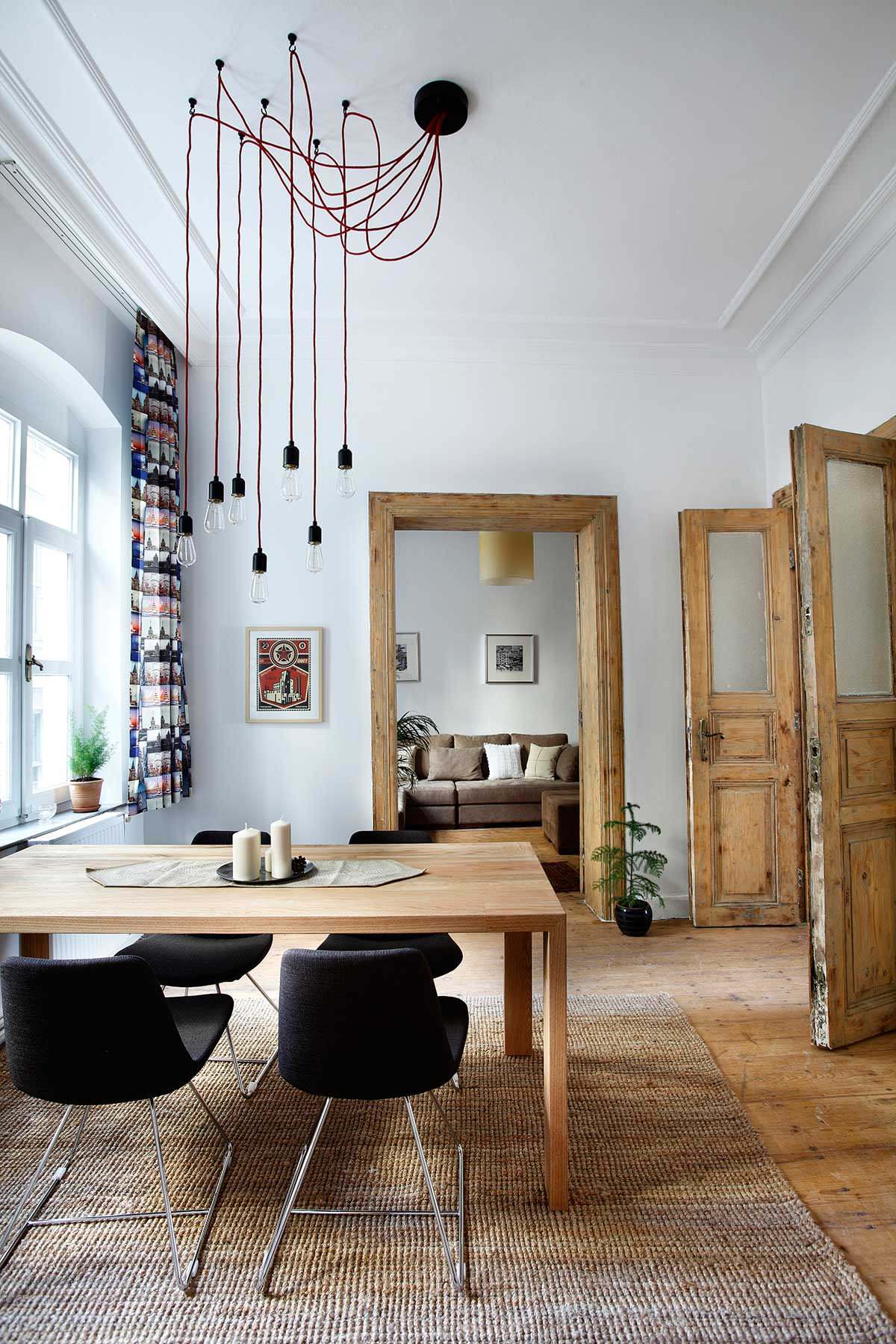 The dining set in this home would fit in with many different styles of interior decor but the towering cut log feature wall positively screams rustic. The logs, teamed with two huge rattan lampshades and a red accent dining chair, really warm up a cold white kitchen diner space. The tribal print rug finishes off the tiny but tenacious dining spot.