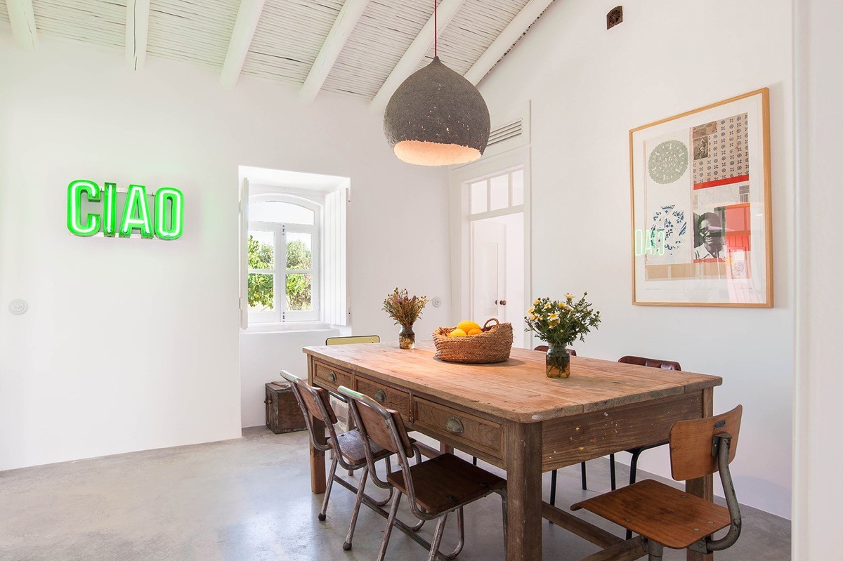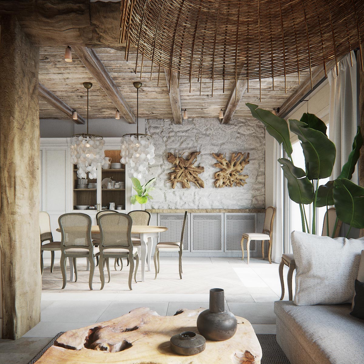 Rustic decor is mixed with coastal flavour here. Driftwood artwork is mounted on one wall, and two mother-of-pearl chandeliers shimmer over the elegant dining table.