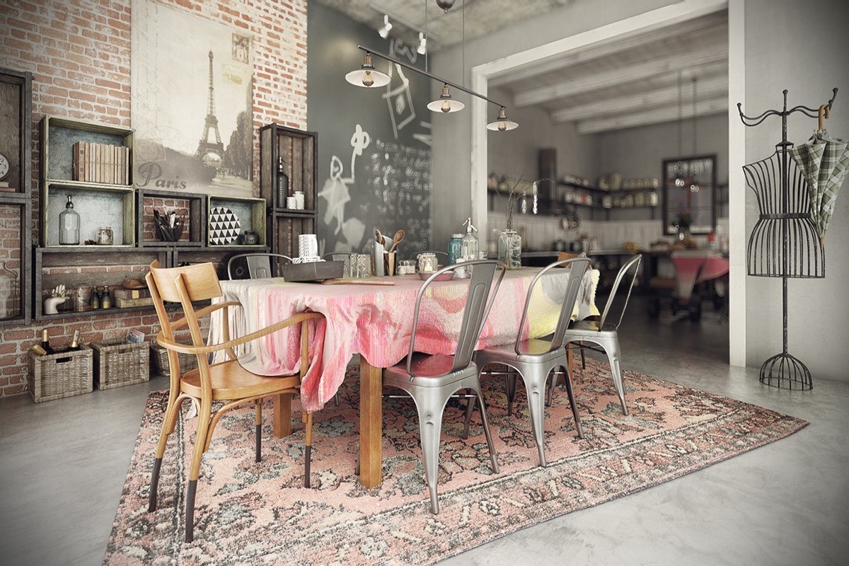 A pretty tablecloth adds an unexpected pop of delicate colour over an industrial dining set.