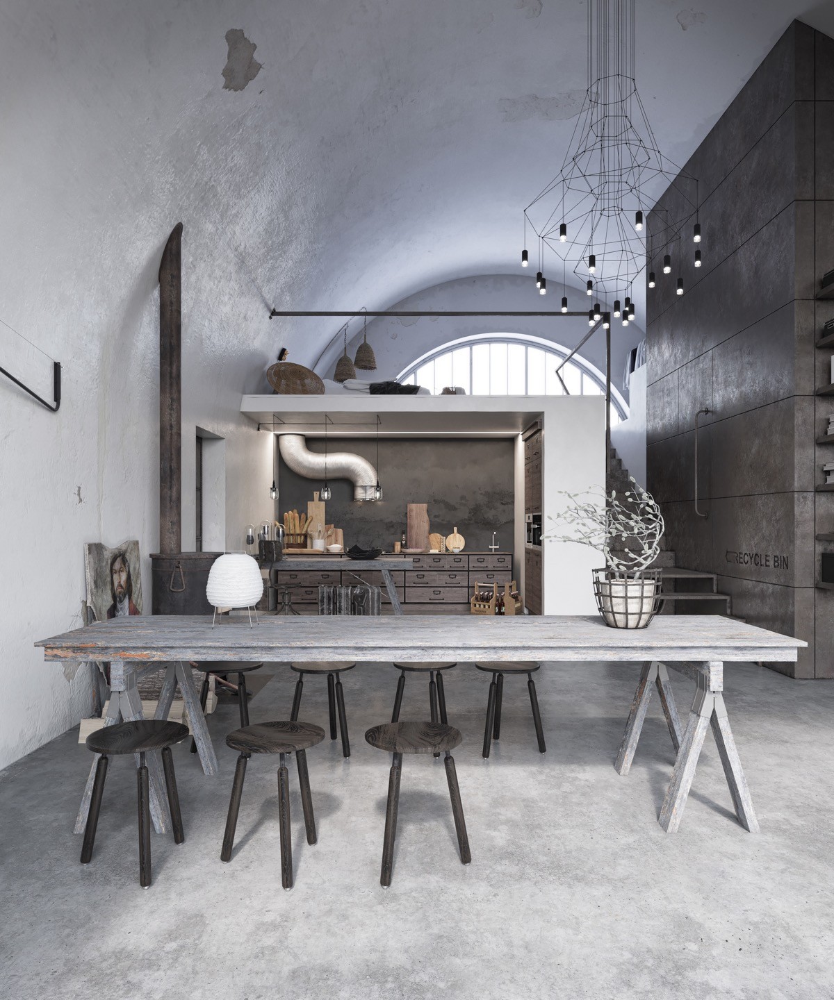 Rustic and industrial are two aesthetics that meld perfectly together. Here a set of stools have been teamed with a long tressle table. A concrete and metal planter decorates one end.