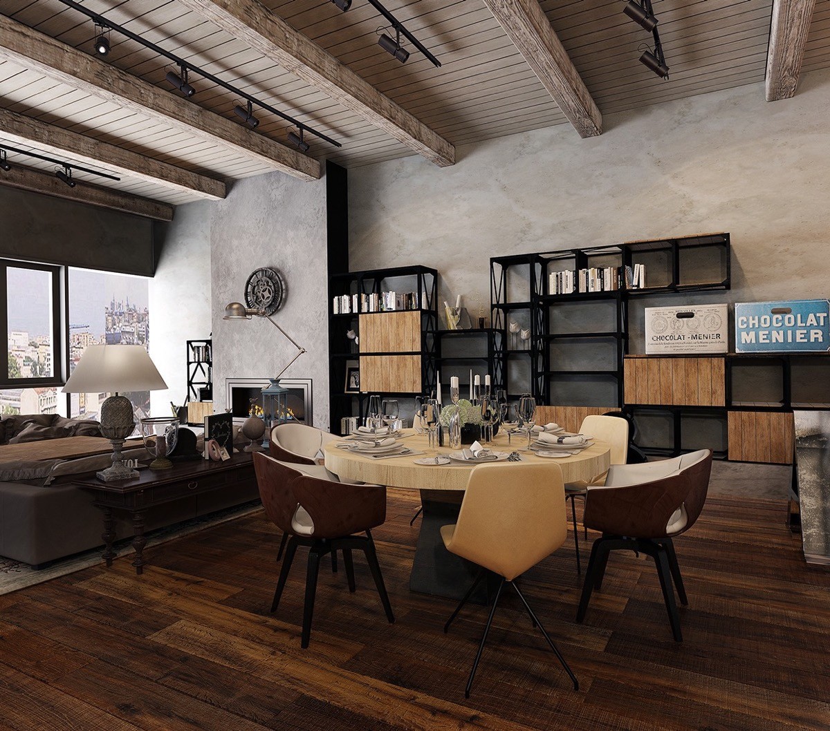 Rustic wood and metal shelving units provide a great backdrop to this refined dining table set.