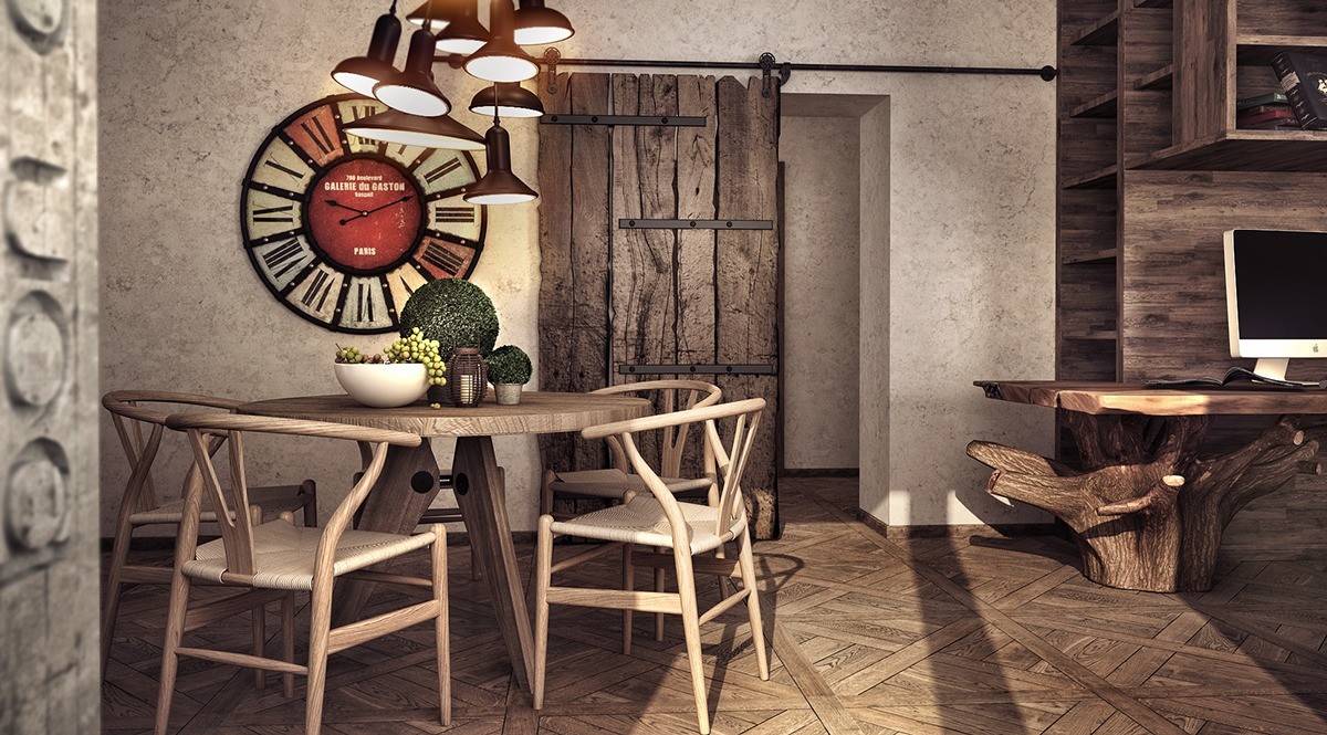 A large wall clock can also fill up an empty dining room wall. This colourful one looks great beside the authentic barn door and cluster pendant lights.