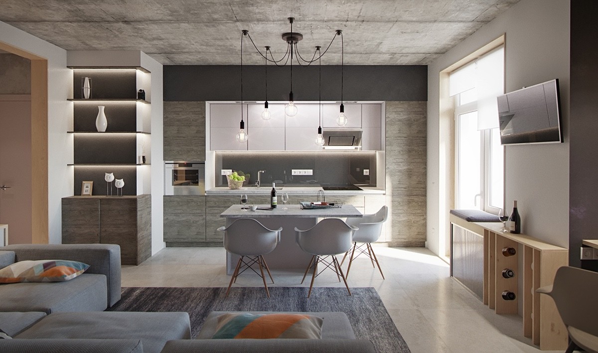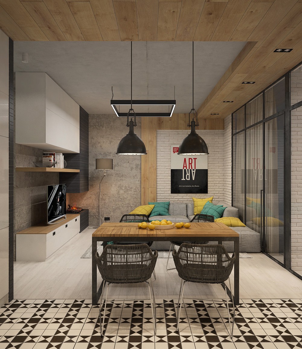 This modern tribal chic home has a pale wood dining bench tucked neatly behind a sofa, coupled with contrasting black bar stools.
