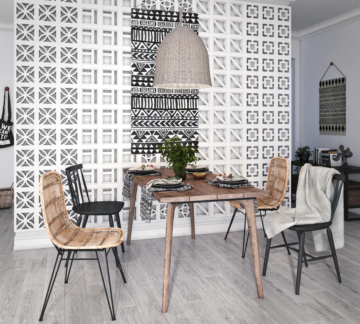 This dining space has a tribal influence, brought in the form of a monochrome tribal print wall hanging and matching cloth napkins. A set of four chairs are made up from two black painted wooden seats and two in natural rattan. The slight mismatch brings a good dose of personality and individuality.