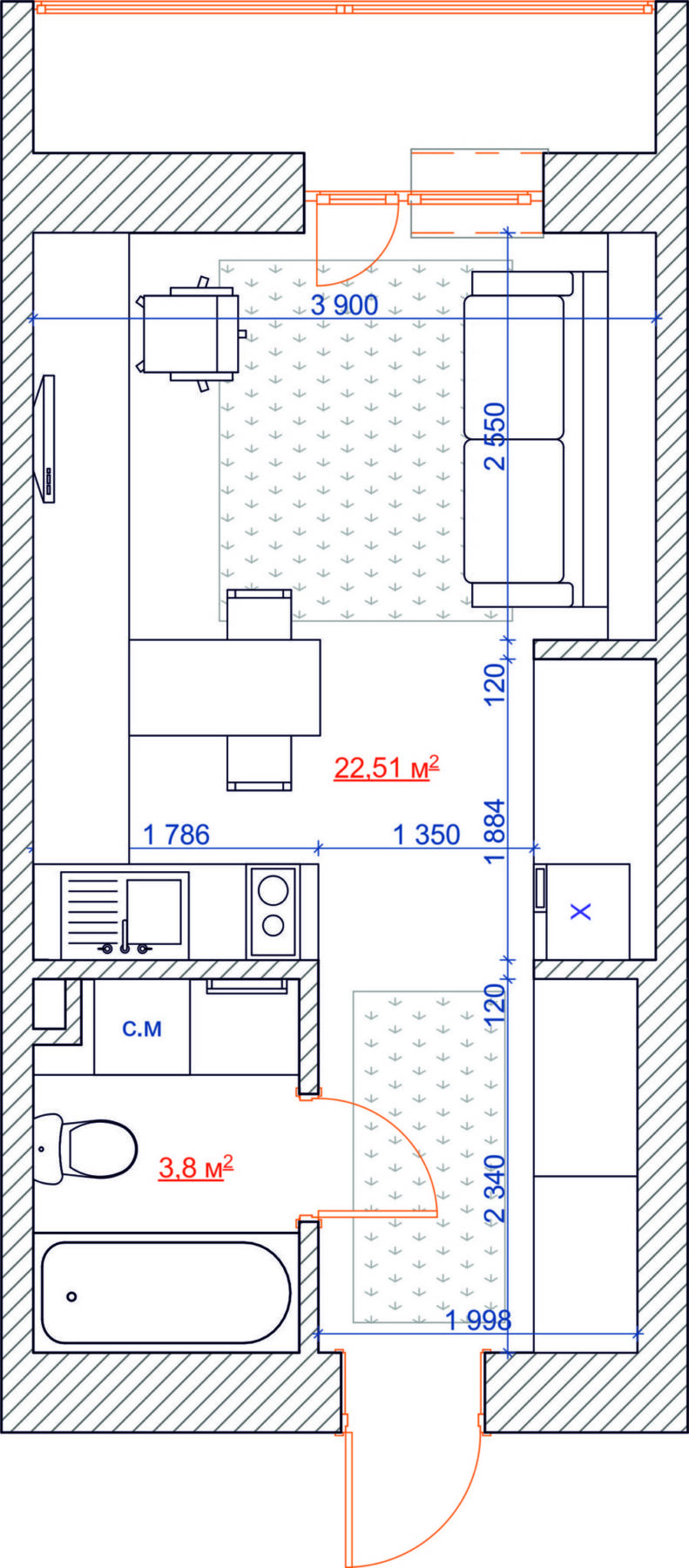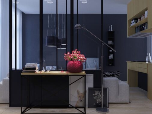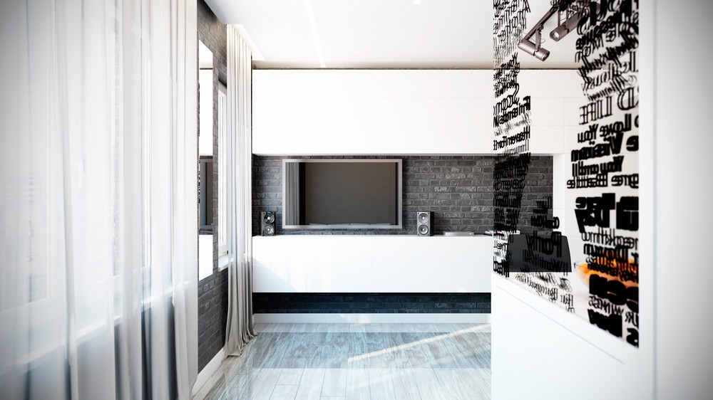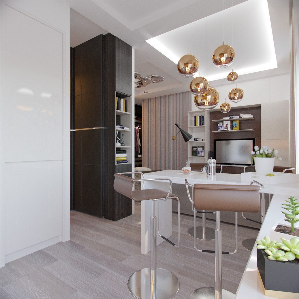 Designed for a young woman, this interior is defined by its smart layout and expertly framed zones. Within 26 square meters, the requirements included a kitchen that feels independent, a spacious wardrobe, and a workable office space. Here you can see the office taking up residence tucked beneath the television, and the transparent Louis Ghost Chair by Phillipe Starck ensures the view goes without obstruction.