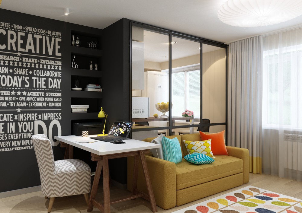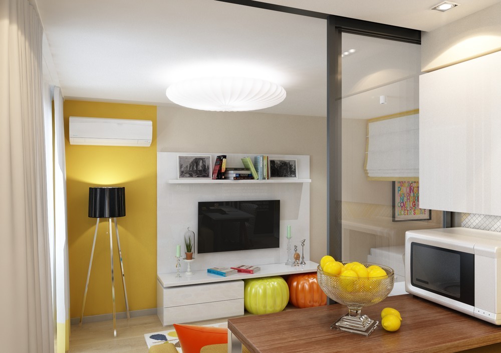 Working with a small space and worried about adding too much color? This small apartment isn't afraid of bold color themes at all! Delightful retro hues energize every square inch: oranges, blues, yellows, and greens… Each color adopts a bright tone, breathing plenty of life into an otherwise restrictive floor plan.