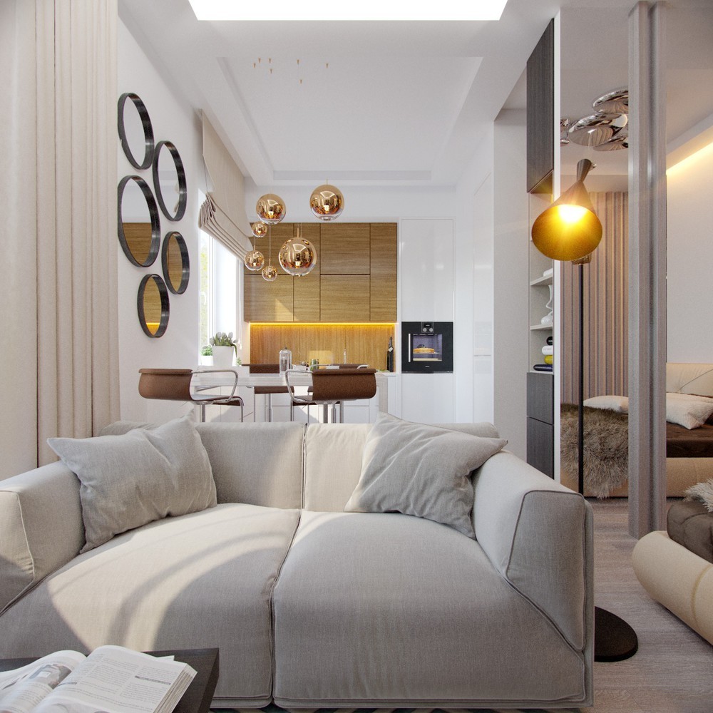 Here's another home designed for a young woman – one who travels often. The designer was inspired by Scandinavian design principals, hence the light-colored wood and the incredible sense of spaciousness. This home utilizes a mostly neutral theme with plenty of warm accents, and a good variety of distinctive round decor for visual interest At under 30 square meters, the amount of division between each space is truly inspiring!