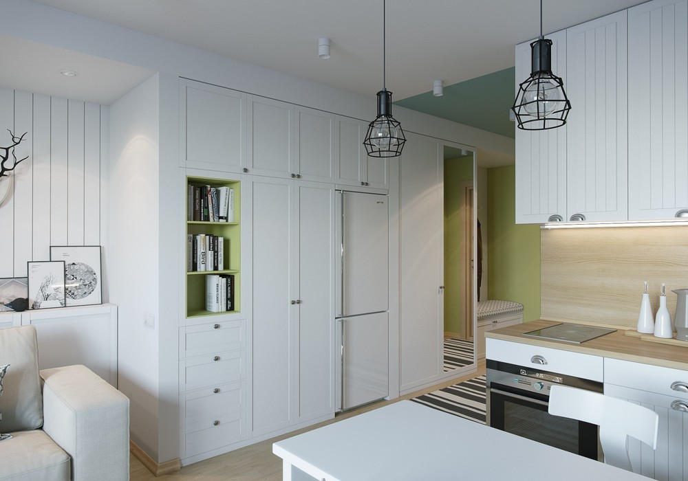 Now for the most important part: the built-in storage along the hallway facilitates the streamlined design in several ways. It not only houses the bookshelves and drawers, but also includes a spot for the refrigerator and the wardrobe.