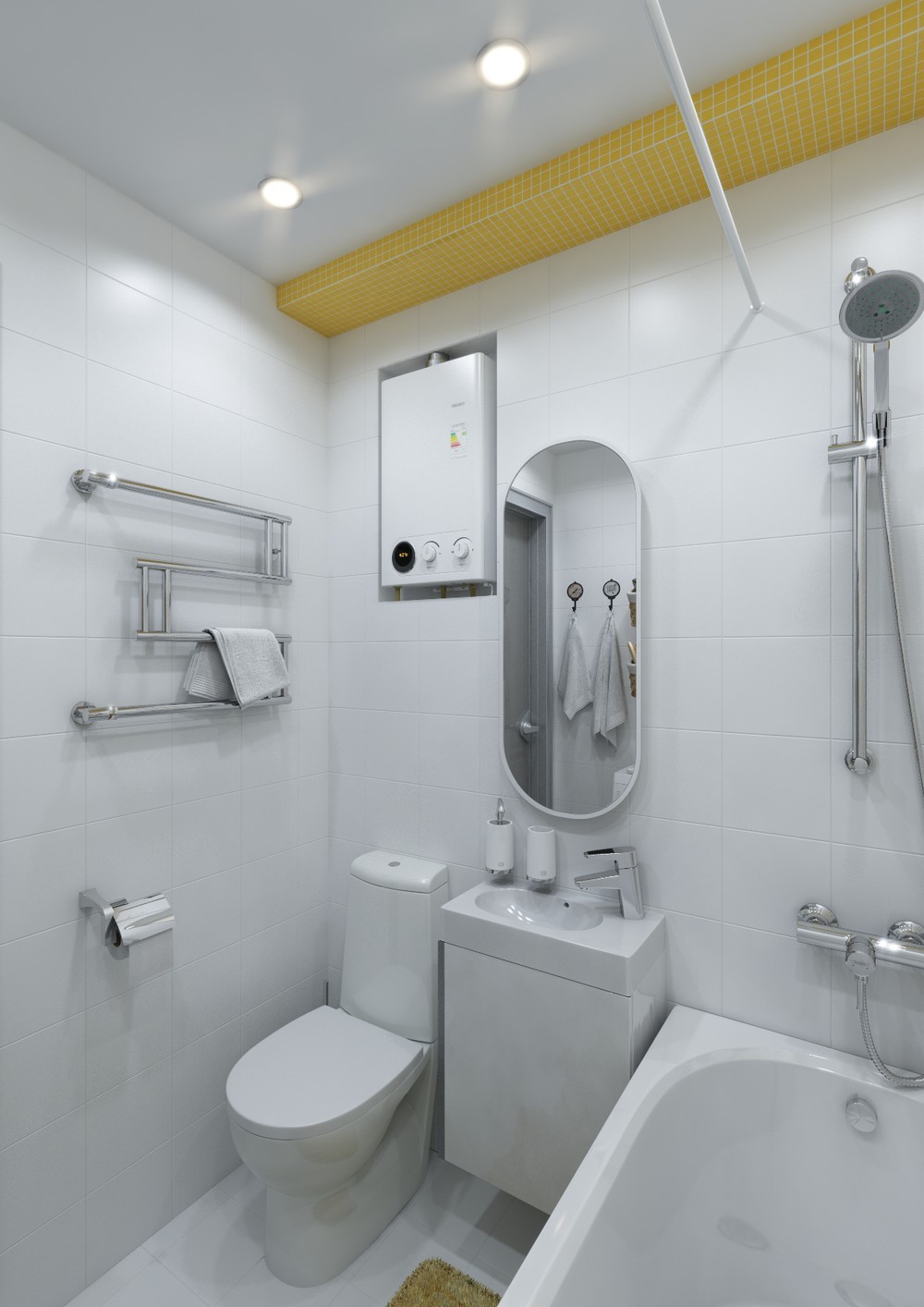Decorated in plain white tile, the bathroom enjoys an overall traditional look with a few cool contemporary features – like the modern fixtures and interesting oval mirror.