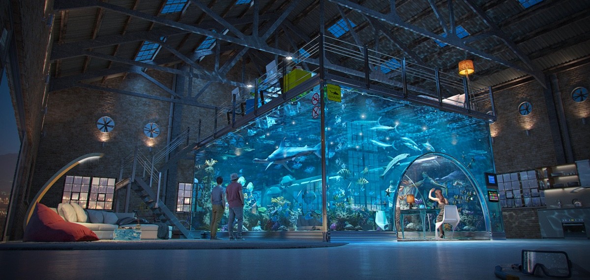 And finally a bit of whimsy! This loft is entirely built around a fish tank fit for any aquarium. Imagine living, eating, and cooking surrounded by such beauty from the sea. The incredible blue hue leaves you feeling refreshed and intrigued, and we love how the water glows against the bricks.