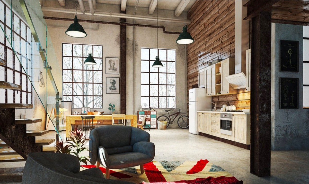 This loft is also a steam punk design - but quite different than the other featured above. With a much bigger space to work with this loft boasts more of the classic loft design elements we love with the steam punk flare that makes this space stand out.