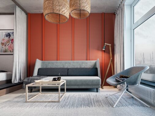 This loft is light, bright, and colorful. We love the accents of blue pink, and orange, and how their pastel color looks against the concrete walls and flooring.