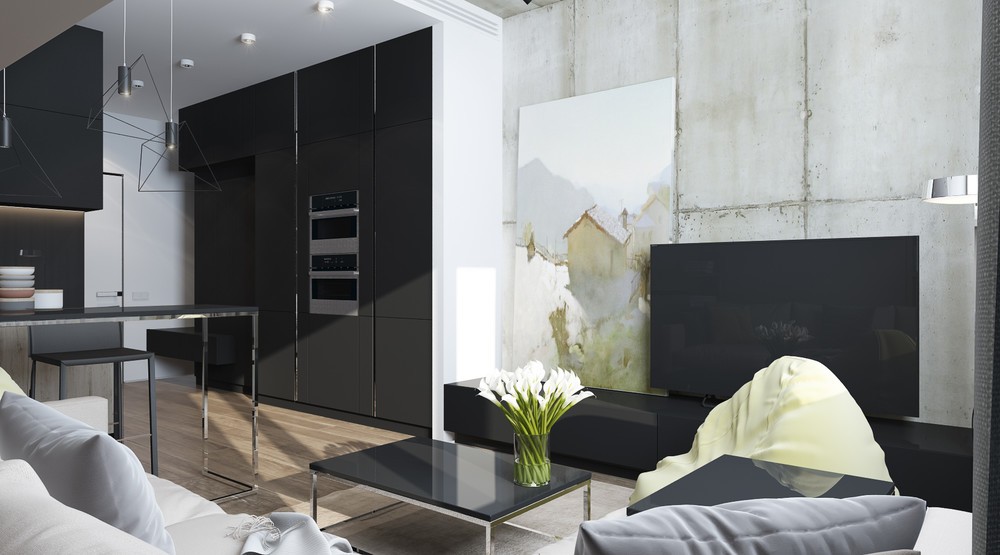 Black and chrome pair perfectly with the concrete ceiling. The industrial influence is easy to appreciate but an occupant with different tastes would have no trouble adapting it.