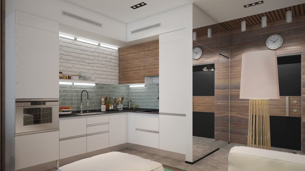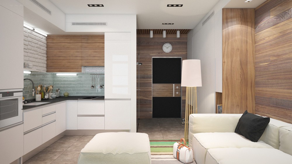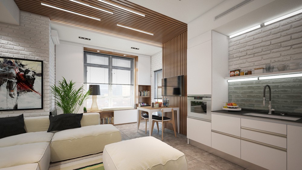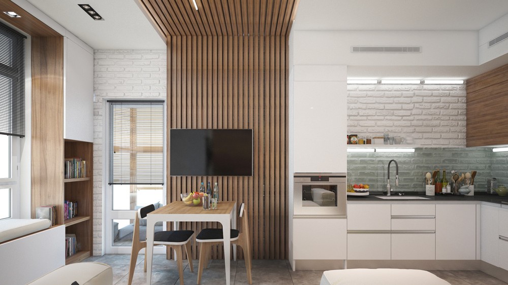Olga Chekmaryov designed this small apartment within a new residential complex – to make the space attractive to renters, natural materials and neutral colors provide the interior with an appealing blank canvas suited to the needs of any future occupant. Warm textures and materials make it feel like home. This apartment is compact but certainly doesn't feel cramped.