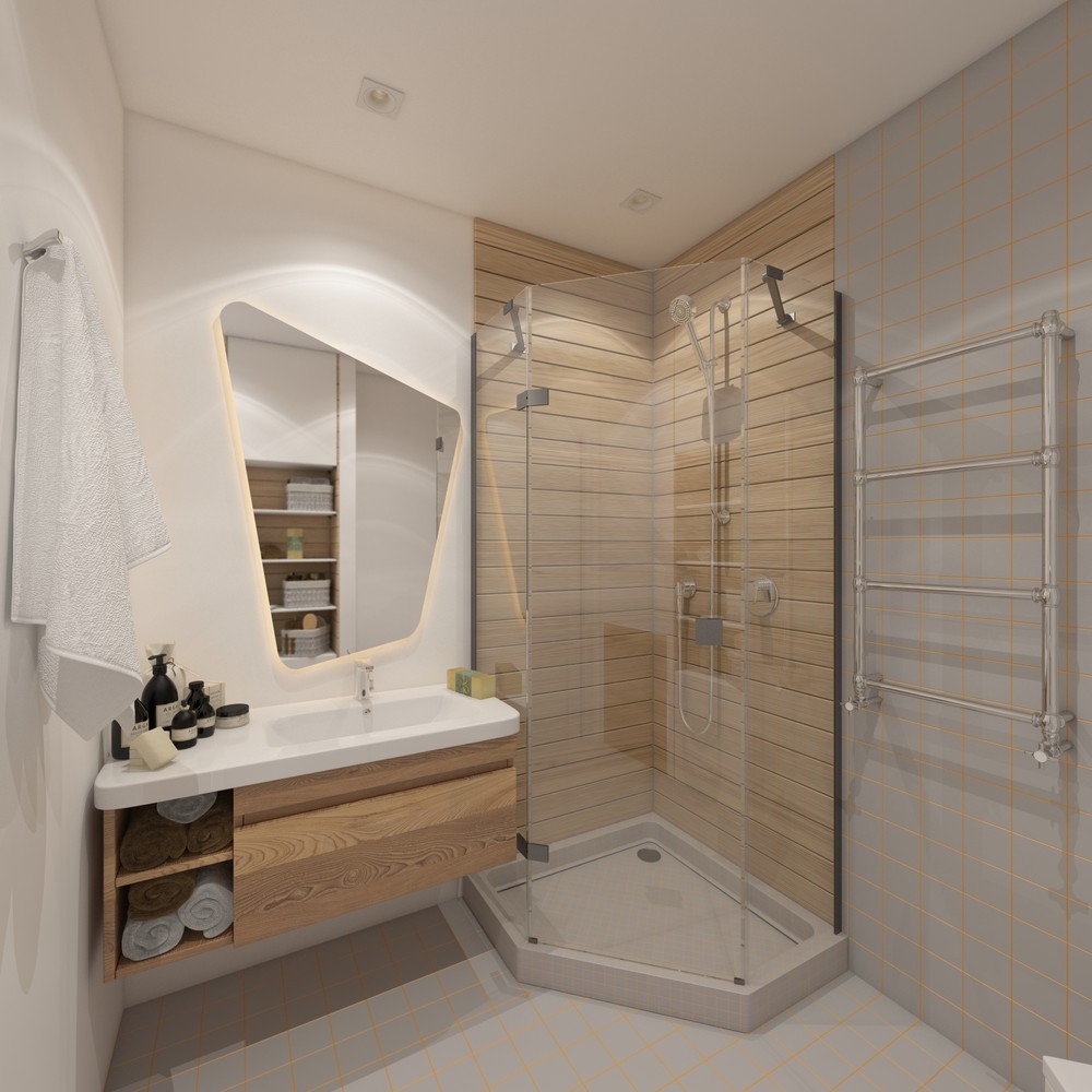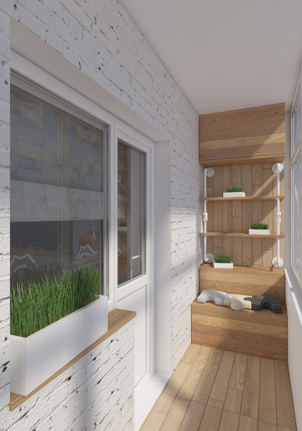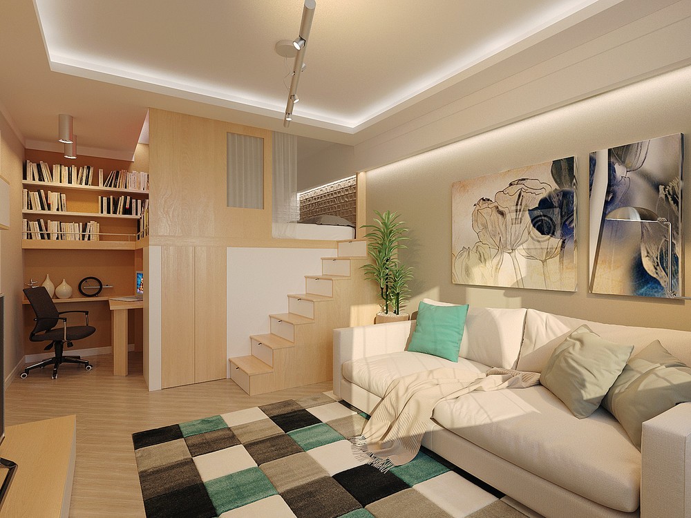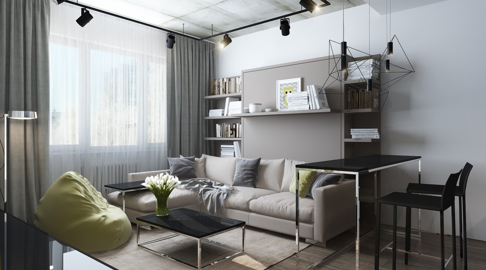 Our final compact home design is the work of Yulia Baranova, with a sweet and stylish home decorated in white and gray with abundant wood cladding. Bright teal accents demonstrate the flexibility of the design – how it could be decorated to fit any style. But perhaps the most impressive feature is the loft bed that takes advantage of the home's high ceilings, freeing up space for storage beneath.