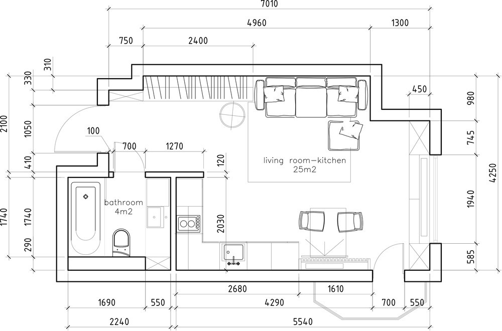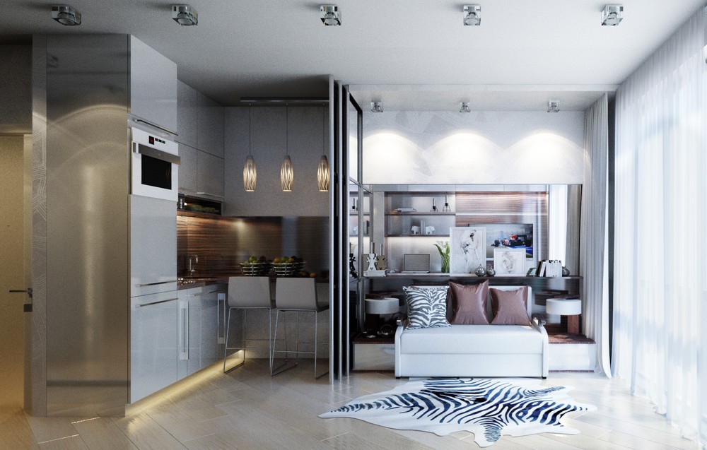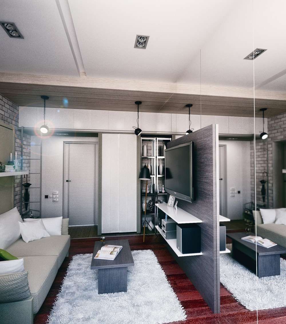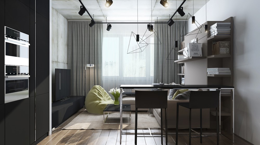This home by Stanislav Aynulov takes a clever approach to space management by integrating dual-purpose furniture and storage wherever possible. Its 28 square meter interior looks simple and spacious – brightened by a colorful geometric rug and gem-toned dining pendant lights.