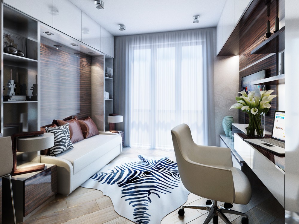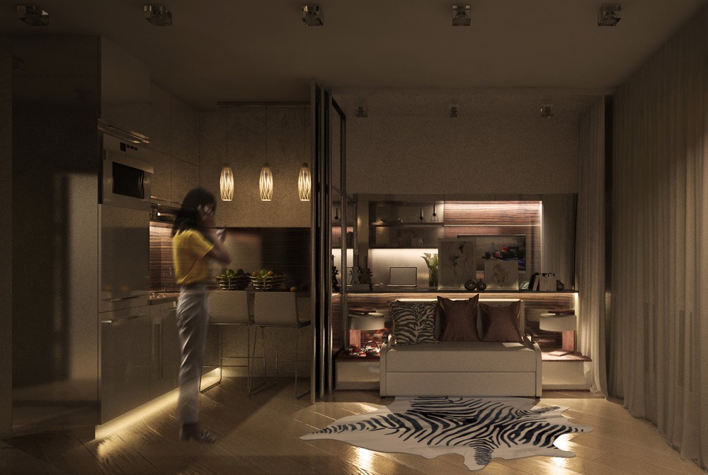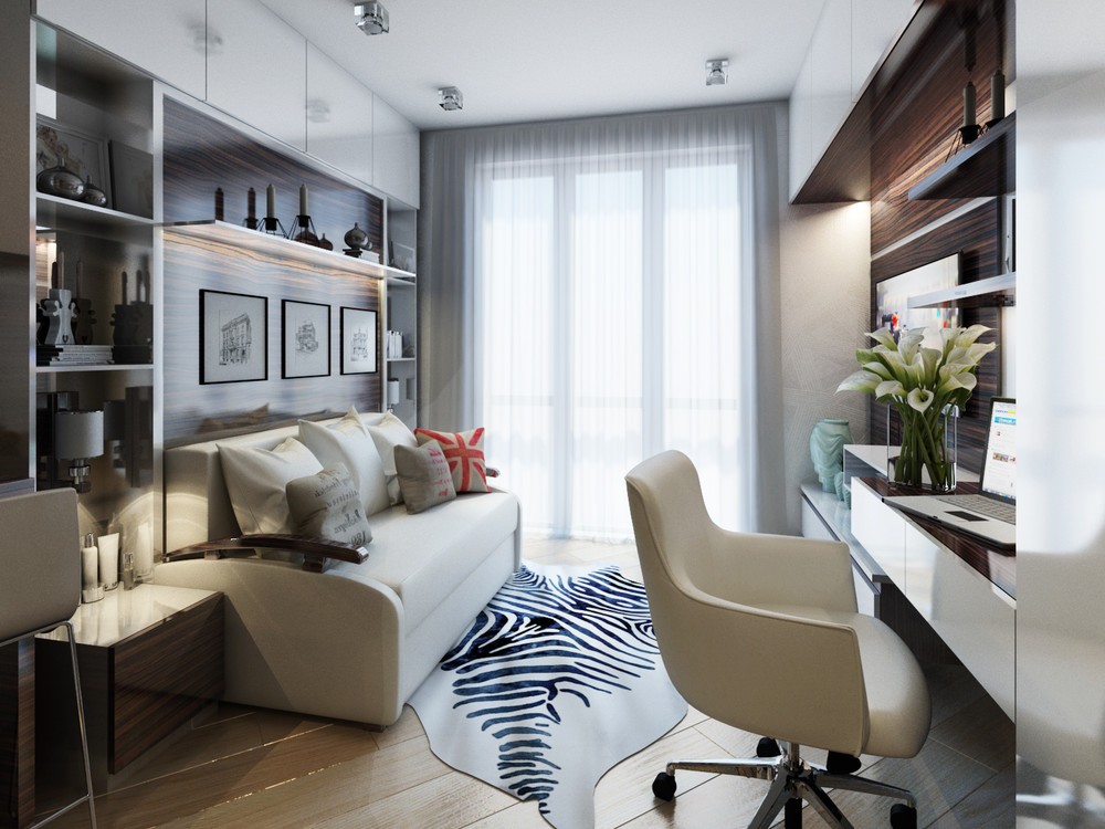 Catherine Remizov designed this apartment with a surprisingly classic and luxurious vibe despite its restrictive 20 square meter floor plan – and the result is bursting with personality! It contains all the necessities, some of which are hidden away with clever tricks to save visual real estate. Every inch of this apartment reflects a strong and adventurous personality, and seems to utilize each available surface for the purpose of expression. Keep reading to see the room visualized in several subtly different styles.