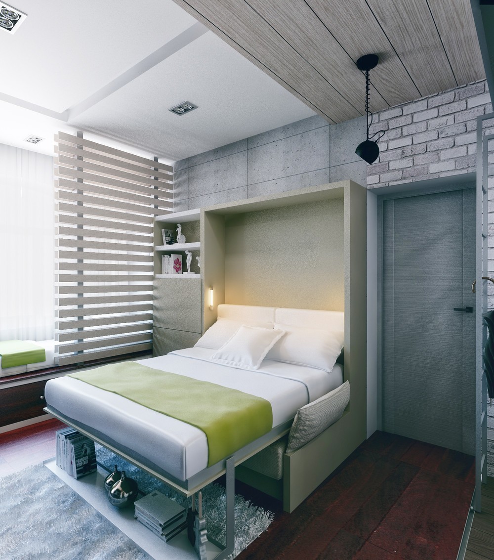 Now, let's take a look at some of the other bedroom configurations the designer visualized to see how flexible this interior really is. This one features sleek wooden paneling behind the sofa-bed, the same pattern used in the kitchen. Shelving surrounds the sofa on all sides.