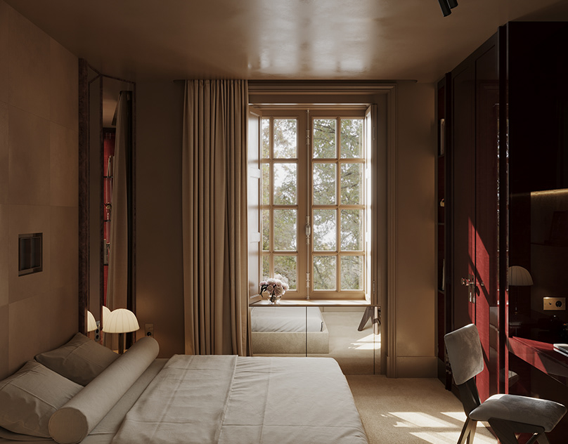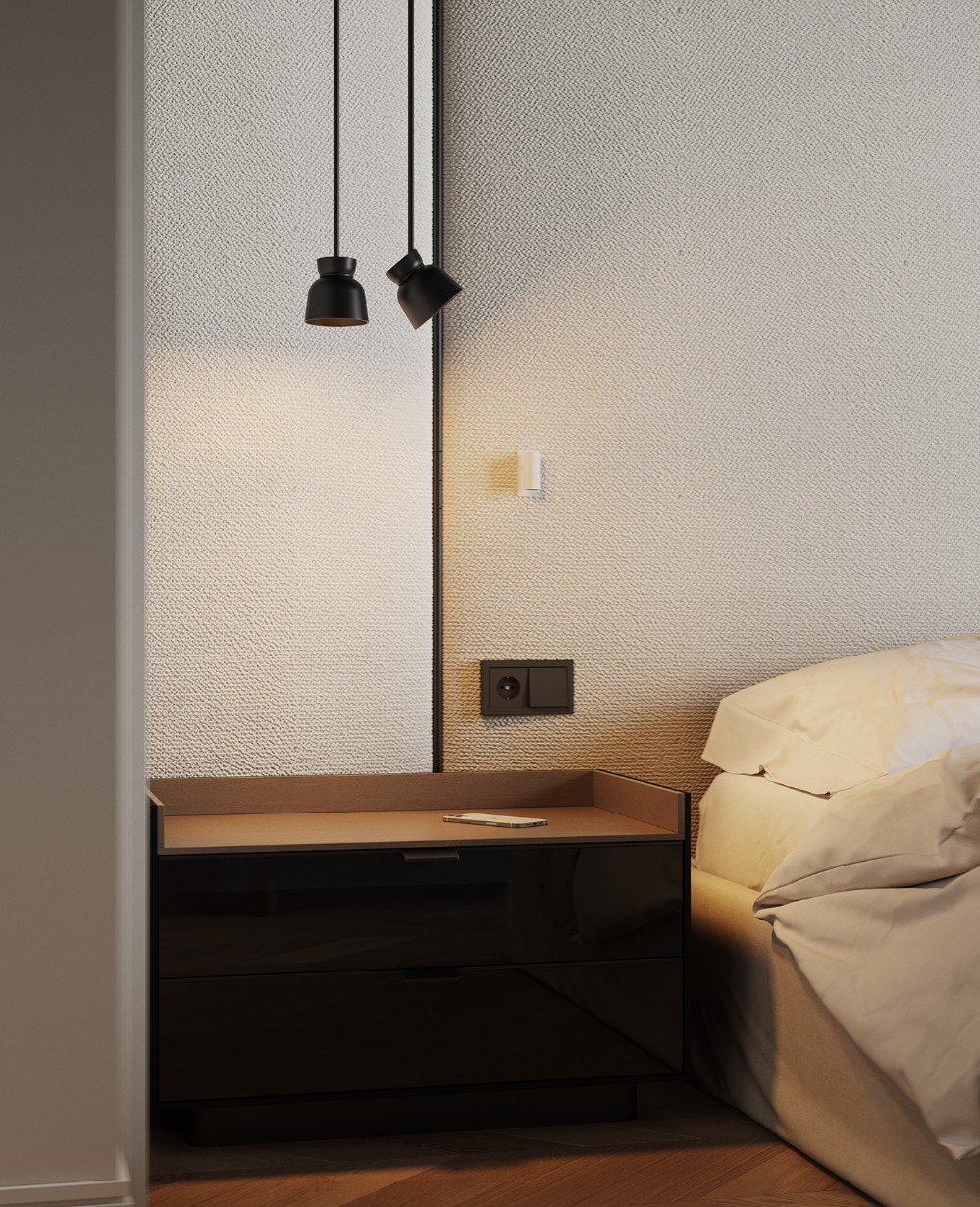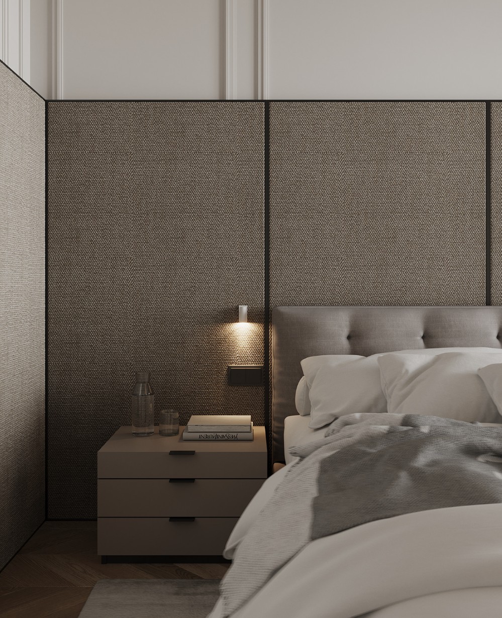 The bedroom stays calm by design. Soft textures, like the upholstered headboard and fabric wall panels, do most of the work. Wall-mounted reading lights keep the surfaces clear and the mood intimate. A slim bedside unit anchors the space, practical but quiet. Along one side, the deep maroon built-in storage introduces contrast to prevent things from getting too boring.