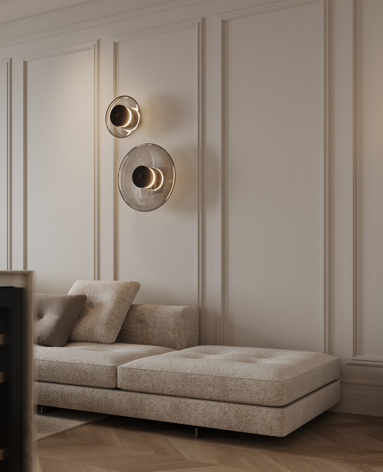 Behind it all, the wall becomes part of the composition (think soft panel detailing, subtle moldings, and clean ceiling lines). Best of all, the sculptural wall lights read almost like art; glowing forms that shift the mood as evening sets in.