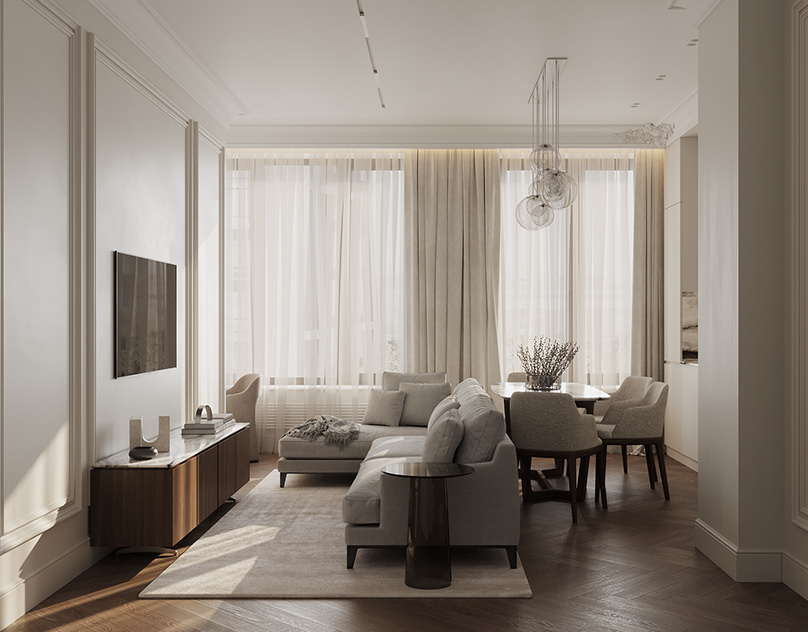 Just beyond, the secondary living area feels lighter and more social. It connects seamlessly to the dining zone, keeping sightlines open and movement easy. The mood stays consistent, but the energy shifts slightly: more conversational, without losing that soft heritage calm.