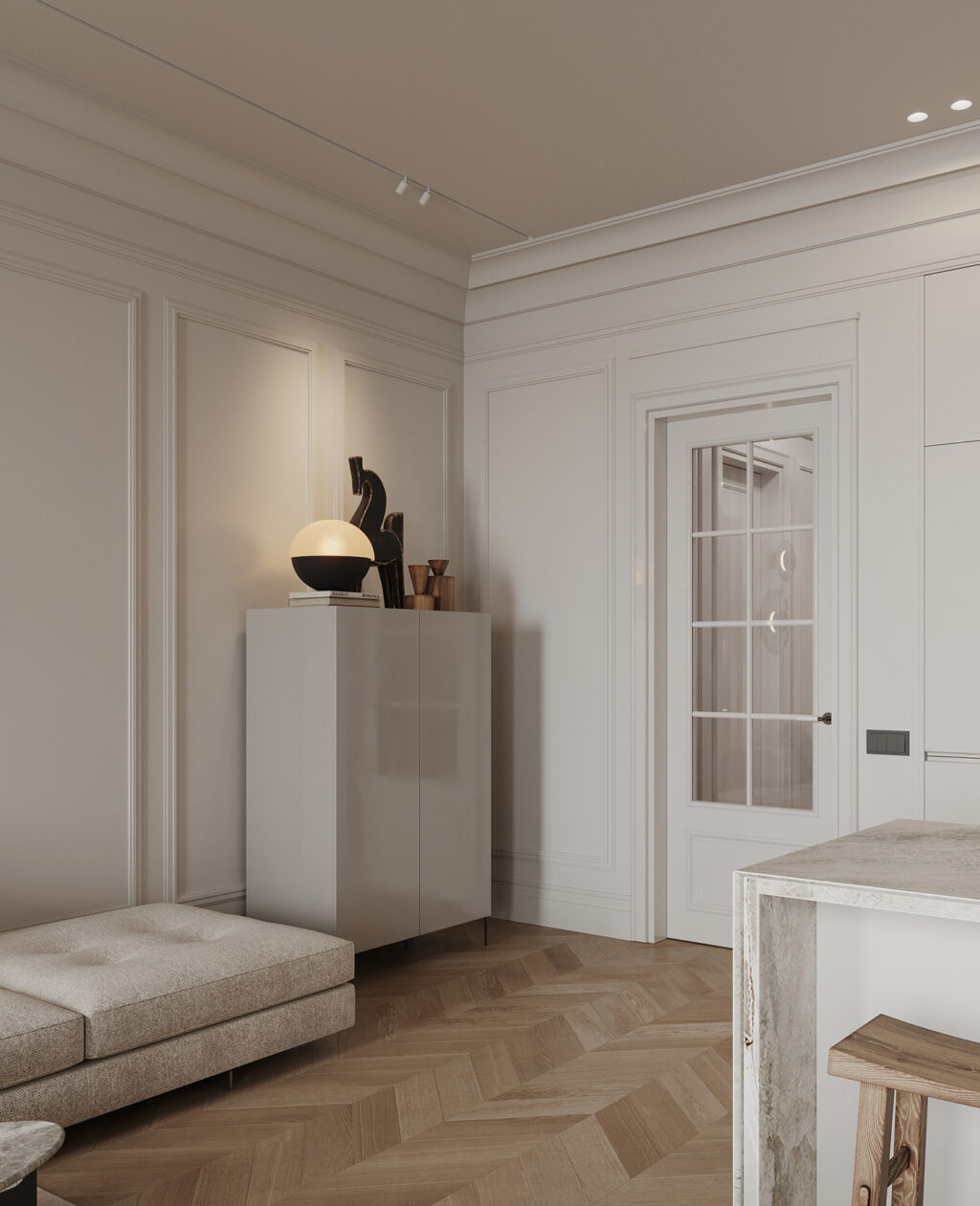 Glass-front cabinetry lines one side, turning storage into a visual element rather than something to hide. Books, objects, and soft reflections add a lovely decorative layer. The glass-paneled door filters light from outside, so the room stays connected yet preserves a sense of privacy.