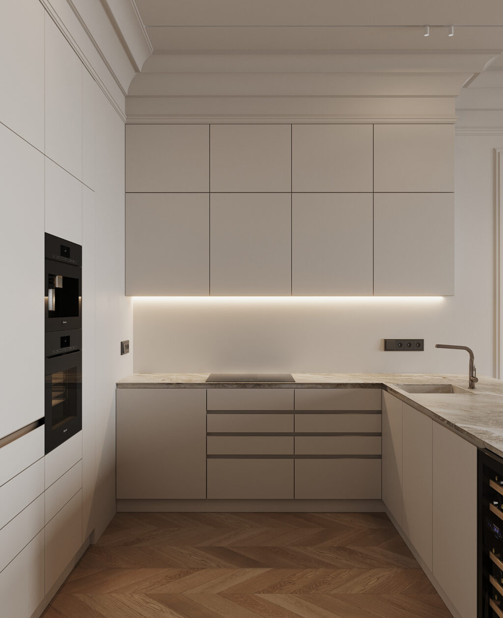 In the heart of the home, flat-front cabinetry runs wall-to-wall, allowing the otherwise utilitarian space feel architectural. The soft, tonal palette does the heavy lifting, while under-cabinet lighting adds a warm glow.