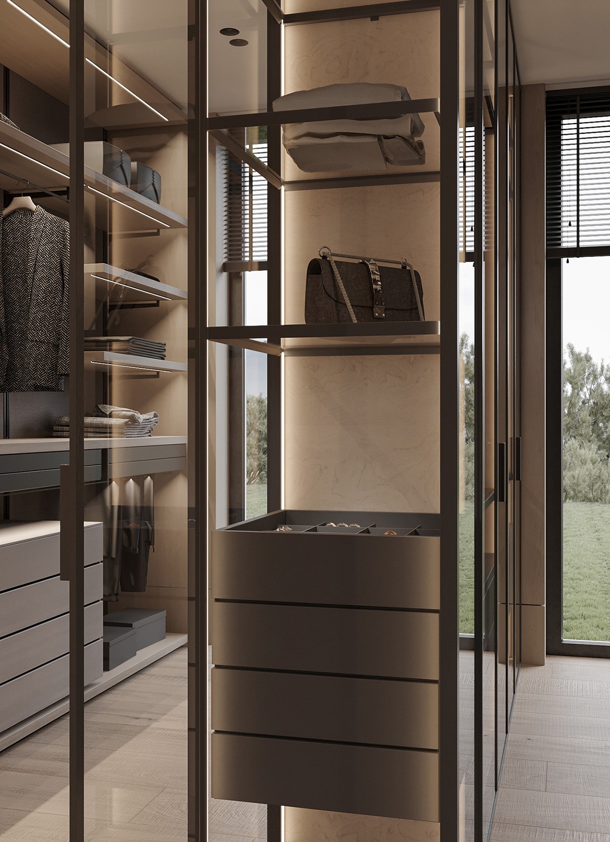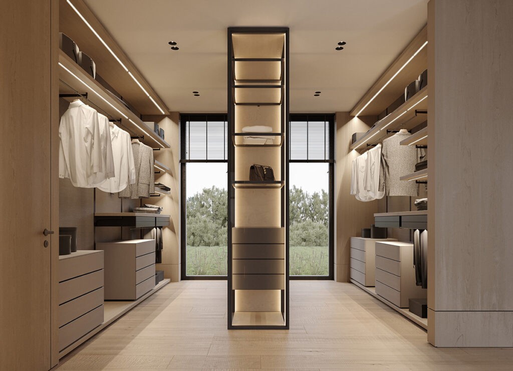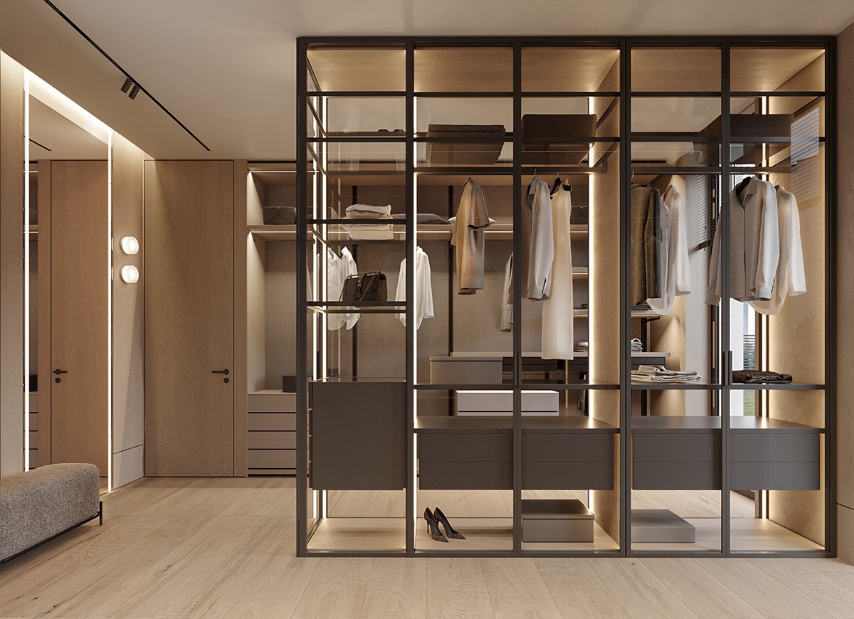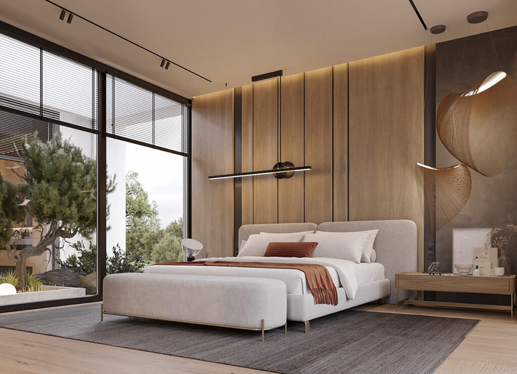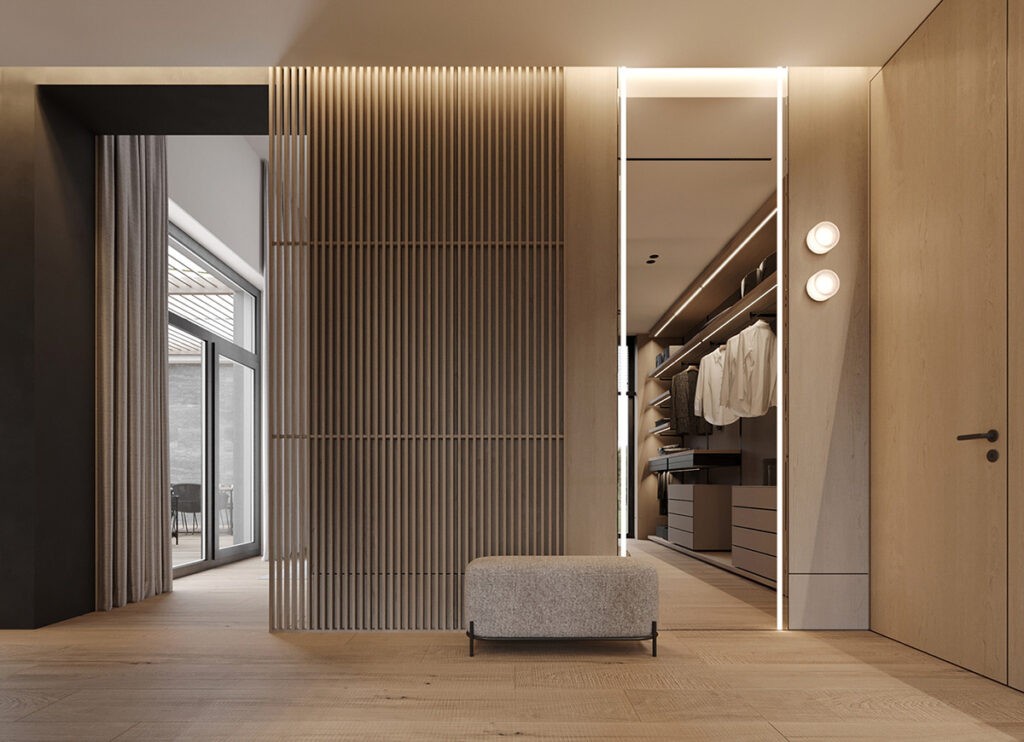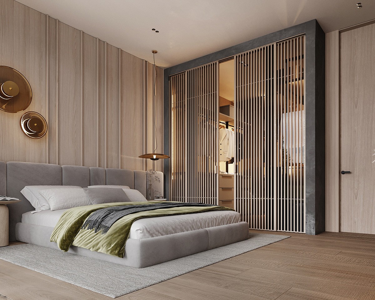This bedroom is as cozy as it gets. A velvet-upholstered bed against a wooden accent wall takes center stage. The slat wood partition with the closet offers functionality, sure, but also adds warmth to the space. It goes without saying that the open closet is suuuper luxurious!