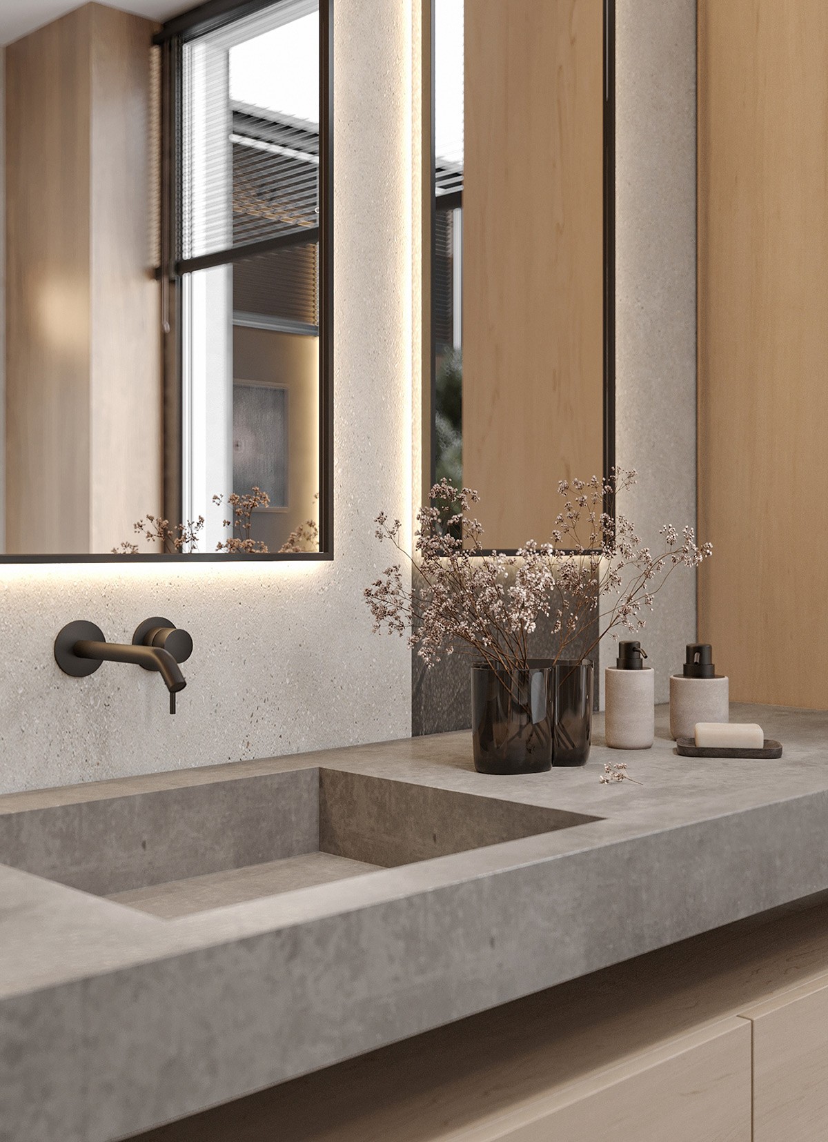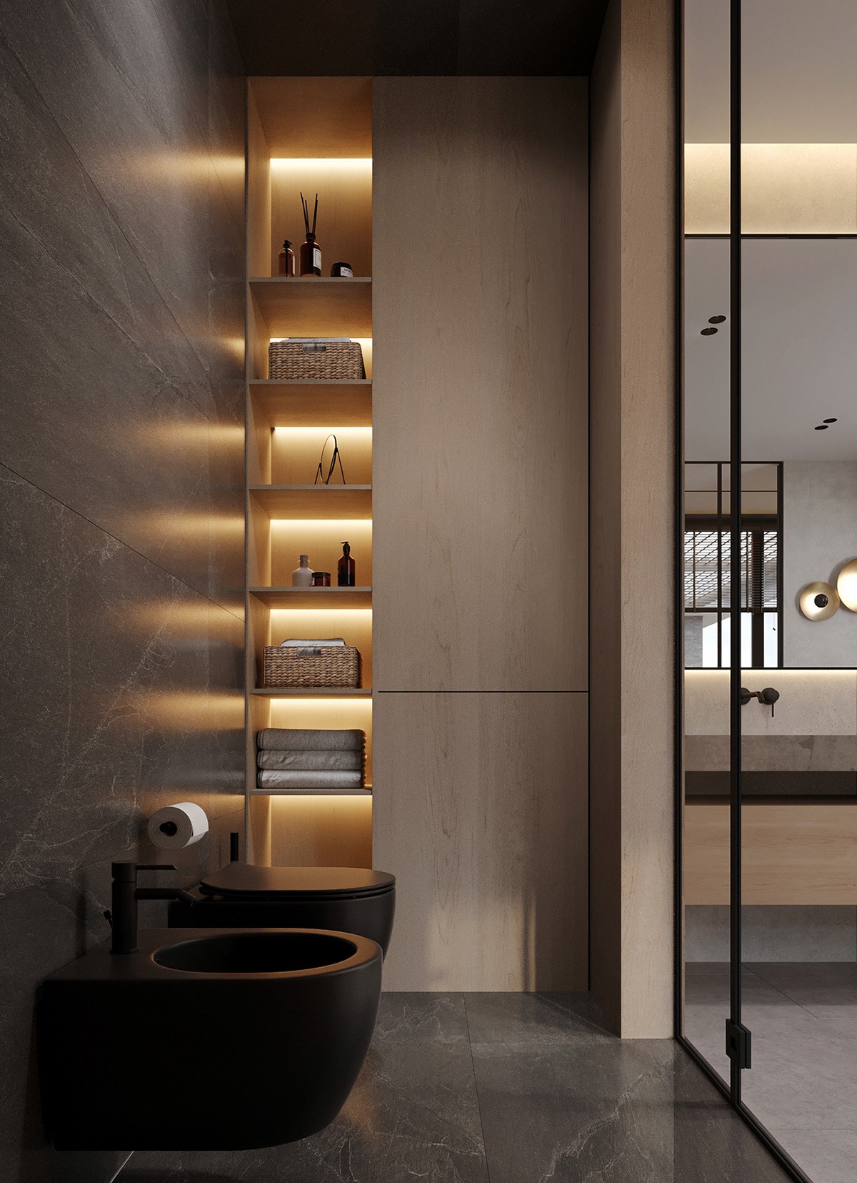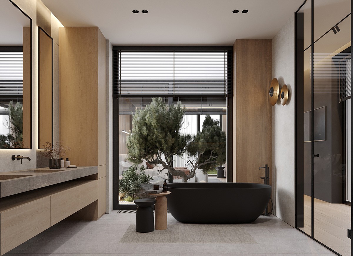When it comes to functionality and style… this bathroom takes the prize! Two matte black wall-mounted toilets—and a similar style standing tub—add opulence. We see a separate cubicle for the shower, while the vanity and cabinetry are equal parts functional and stylish. A special mention for the large plants bringing the outdoors in.