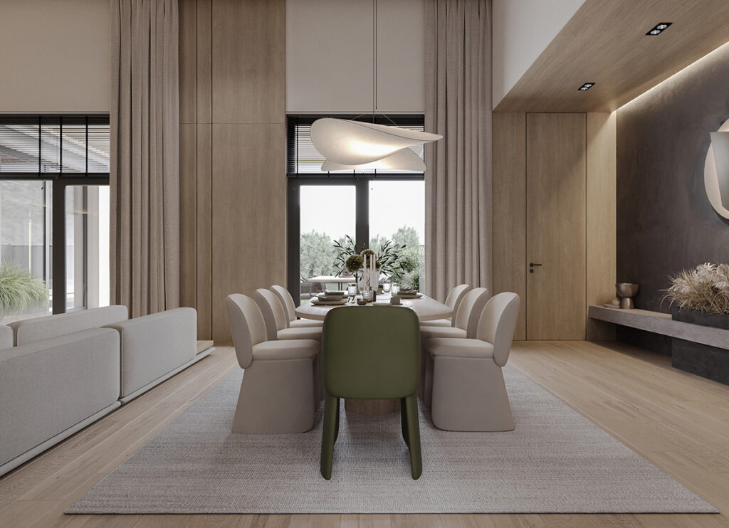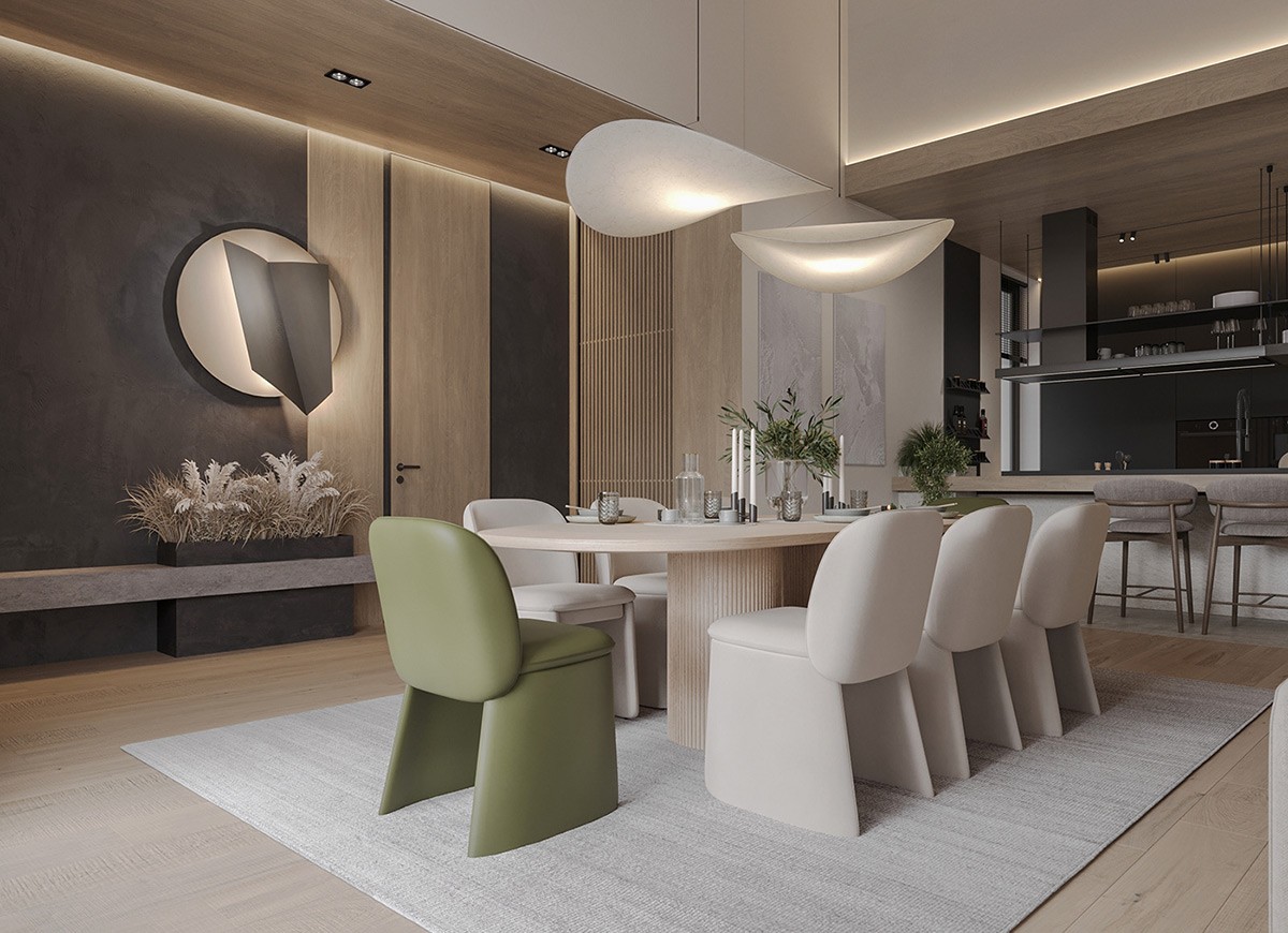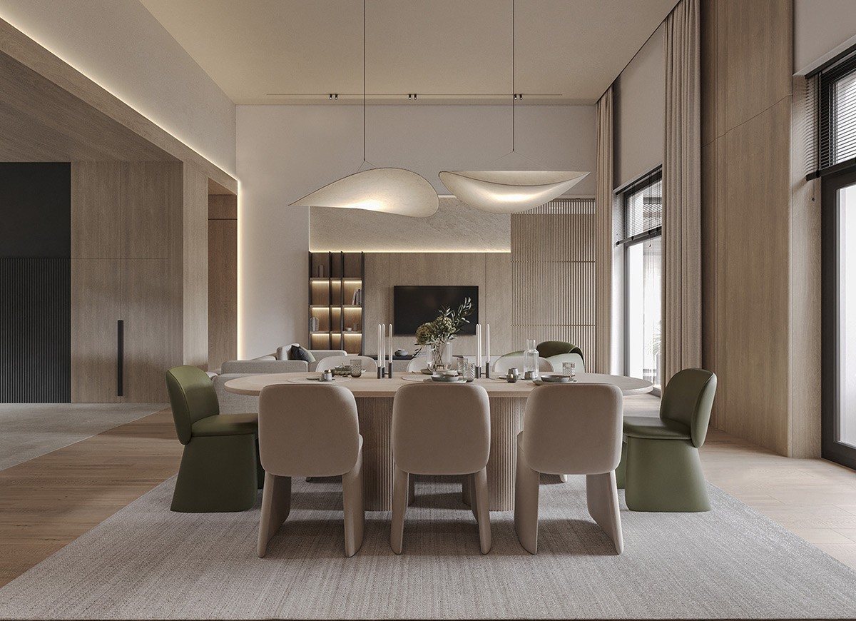 In the open living and dining area, the base is set with soft neutrals complemented by olive green accents. With recessed lights around the ceiling perimeter and backlit shelving, we see beautifully layered lighting. The oversized sofas with clean lines are paired with green armchairs in the living area. A similar color palette is seen in the dining room, where chunky green end chairs create a statement. Throughout the space, potted plants tie the interior with nature.