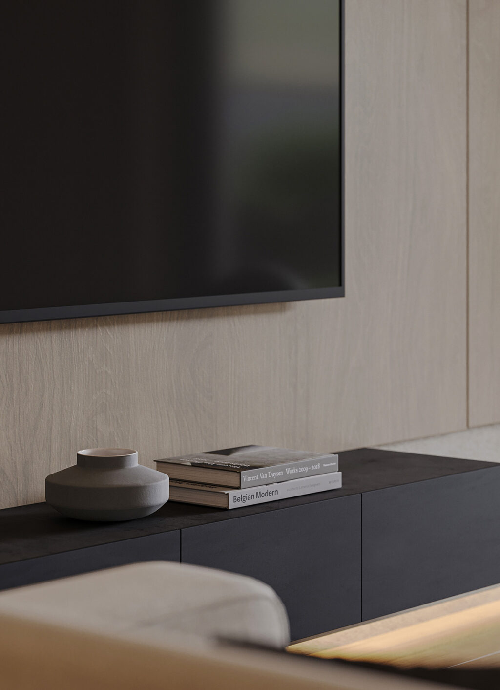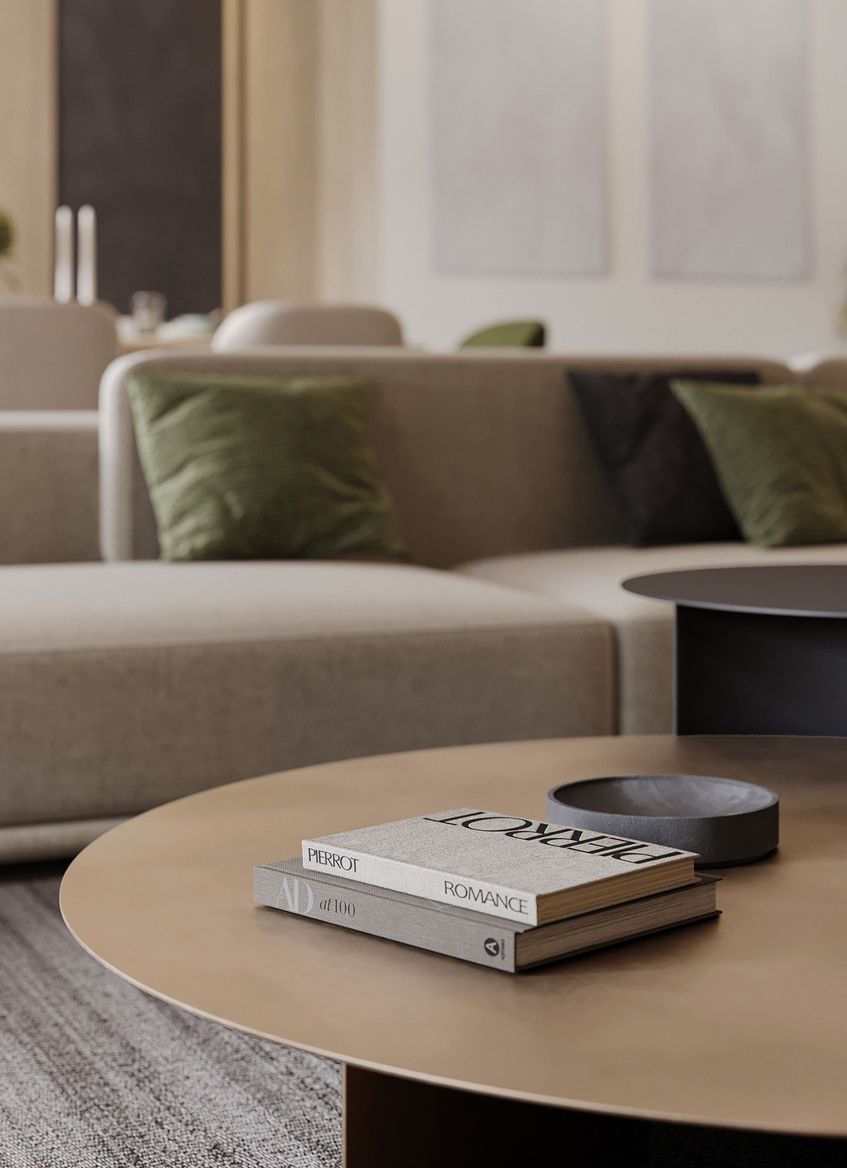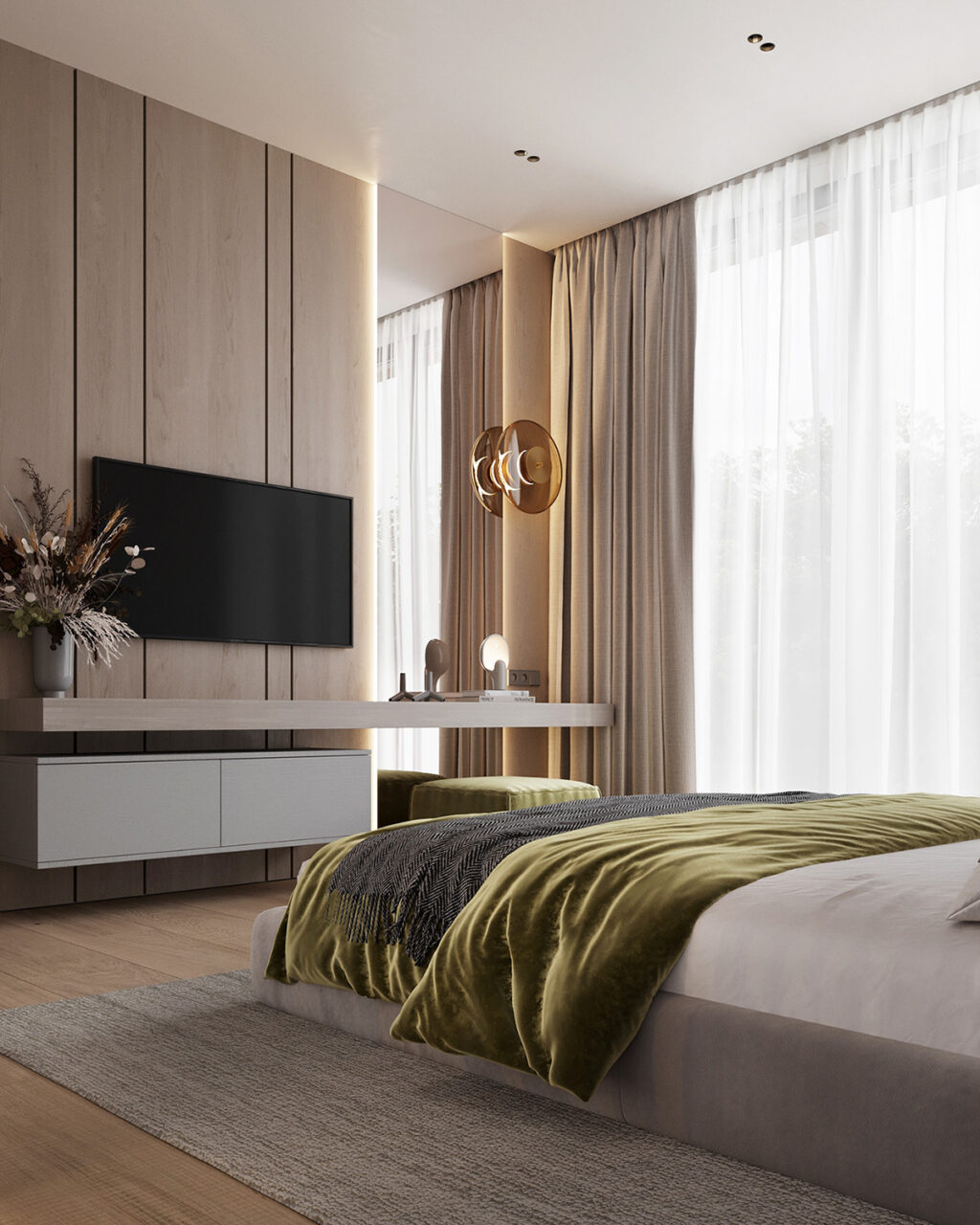 In the open living and dining area, the base is set with soft neutrals complemented by olive green accents. With recessed lights around the ceiling perimeter and backlit shelving, we see beautifully layered lighting. The oversized sofas with clean lines are paired with green armchairs in the living area. A similar color palette is seen in the dining room, where chunky green end chairs create a statement. Throughout the space, potted plants tie the interior with nature.